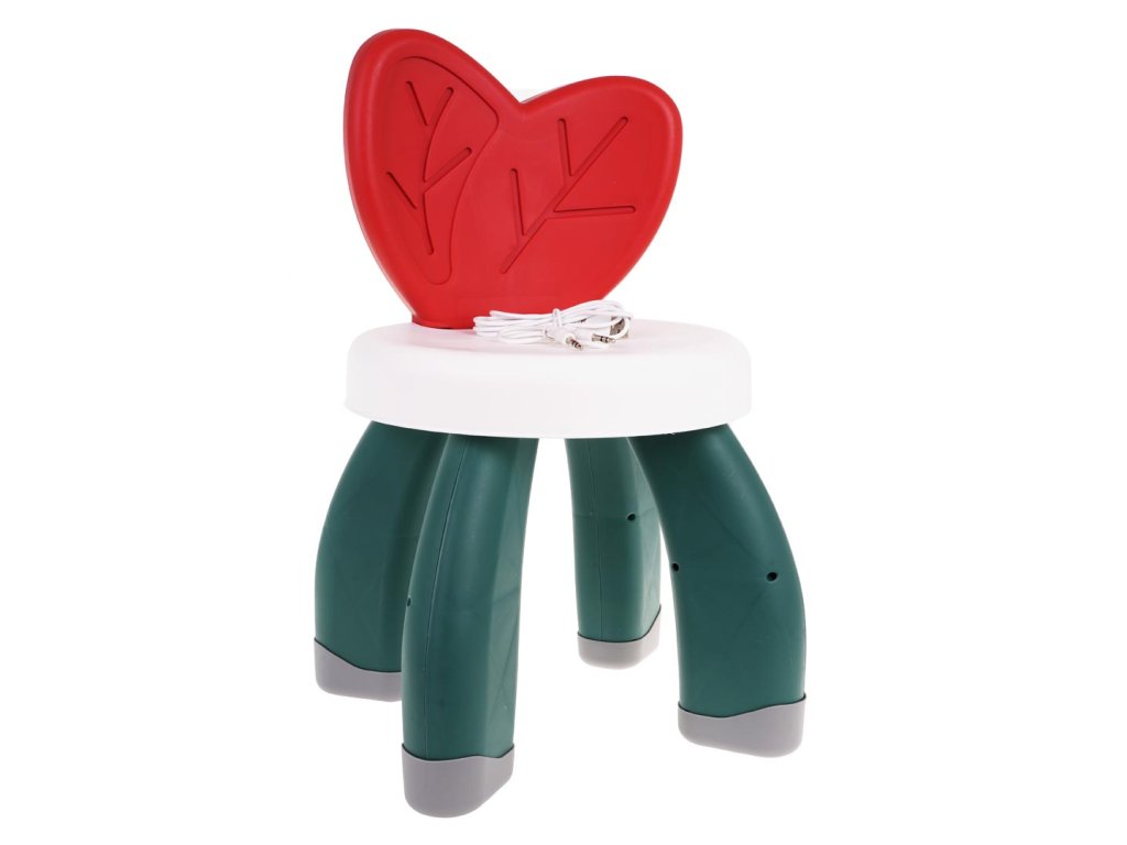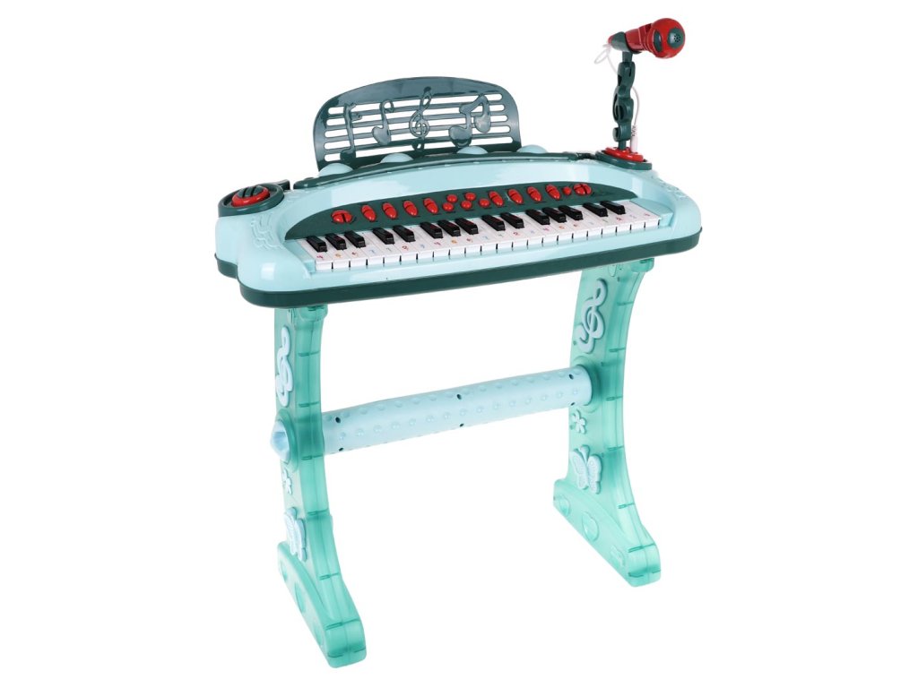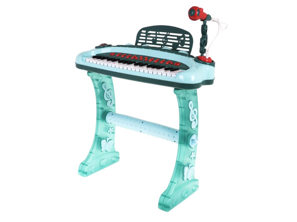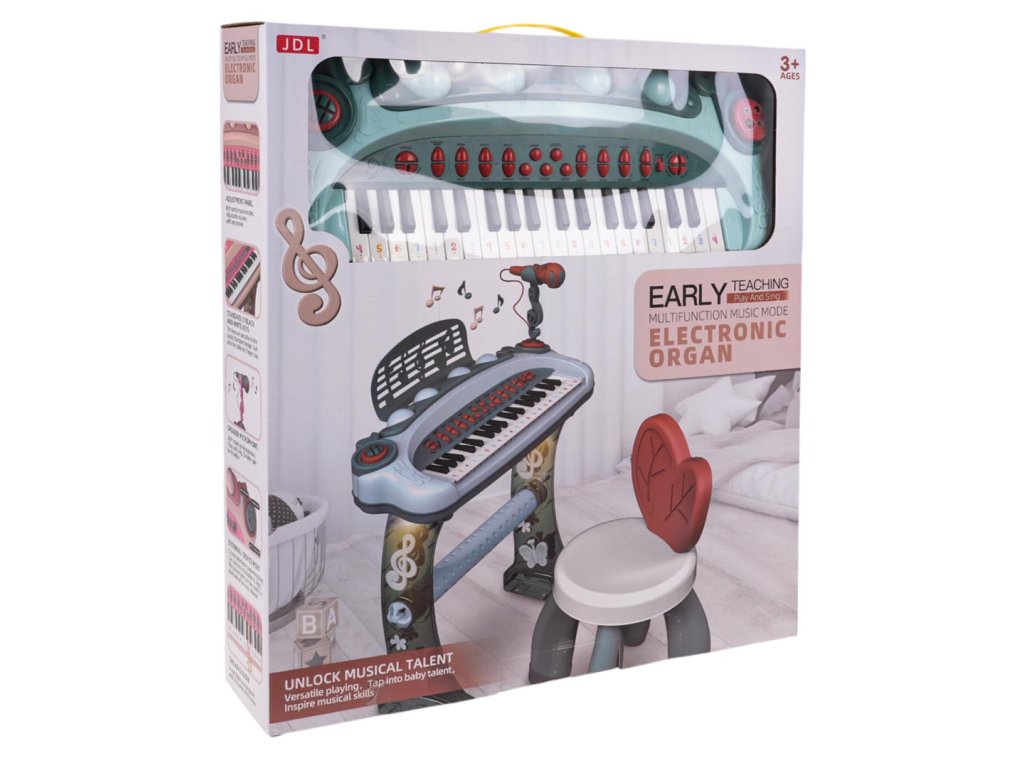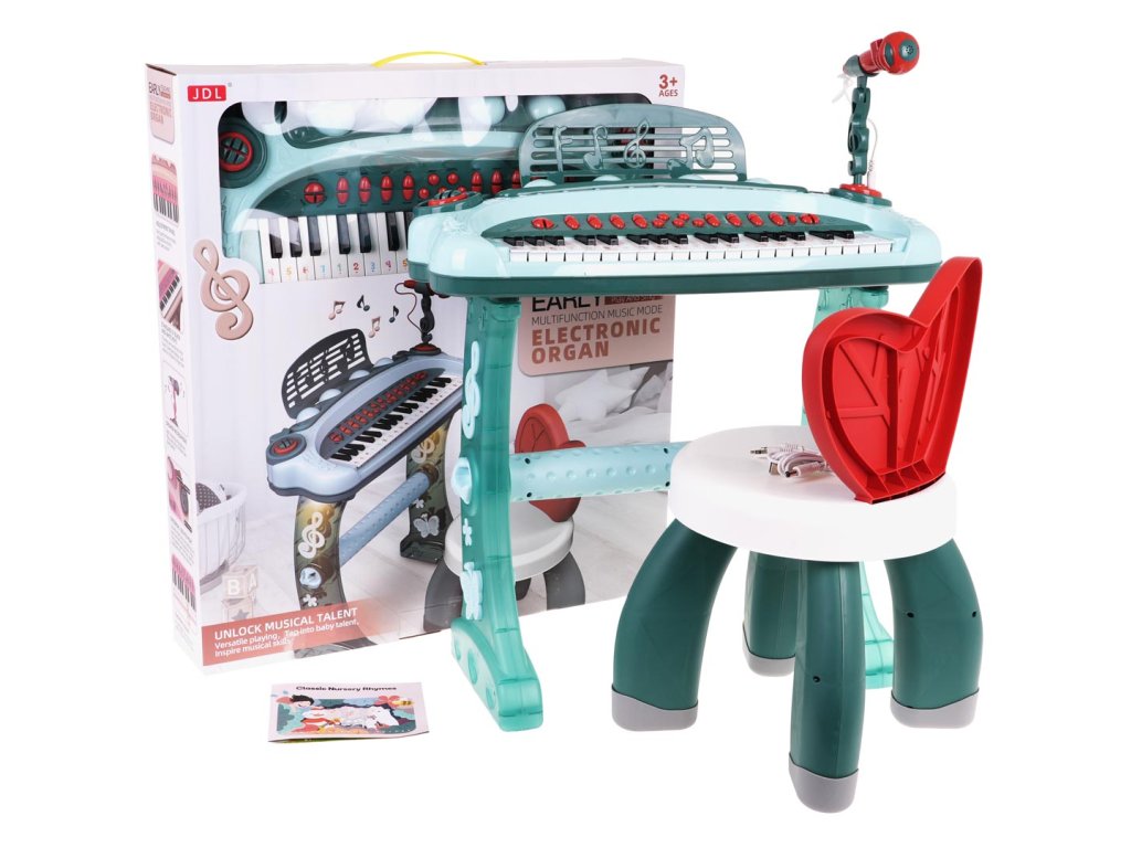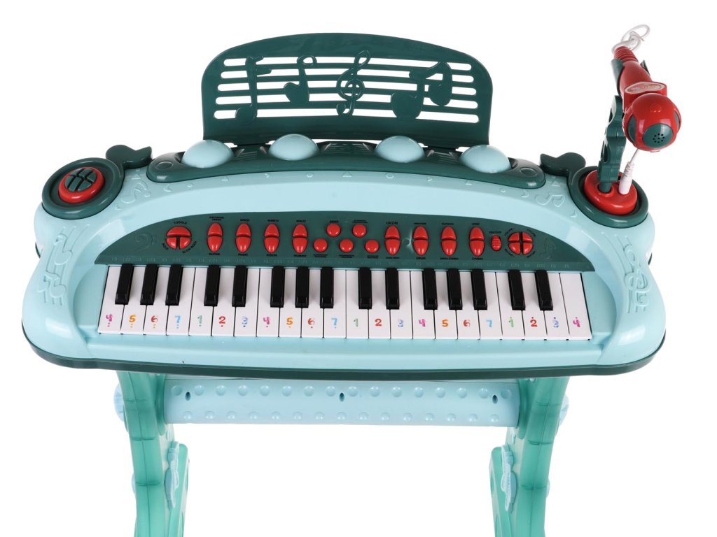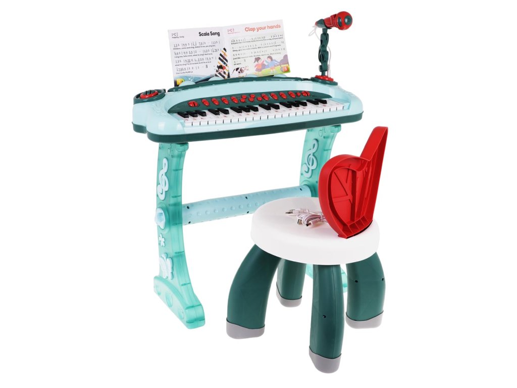 A piano on a stand with a microphone and a stool for children from 3 years of age. The piano is powered by 4 x AA 1.5 V batteries (not included). It has 22 white keys and 15 black keys. The white keys are additionally marked, which makes learning easier, and the set includes a booklet with sample notes to play several songs. When pressed, the white keys light up, as do the sides of the stand. The piano has rock, disco, waltz, march sounds, plays the sounds of piano, trumpet, grand piano, organ and guitar instruments. There is also a demo version that starts cheerful melodies. We can record the songs being played and then play them back. The piano has a microphone input, MP3 input and power input.