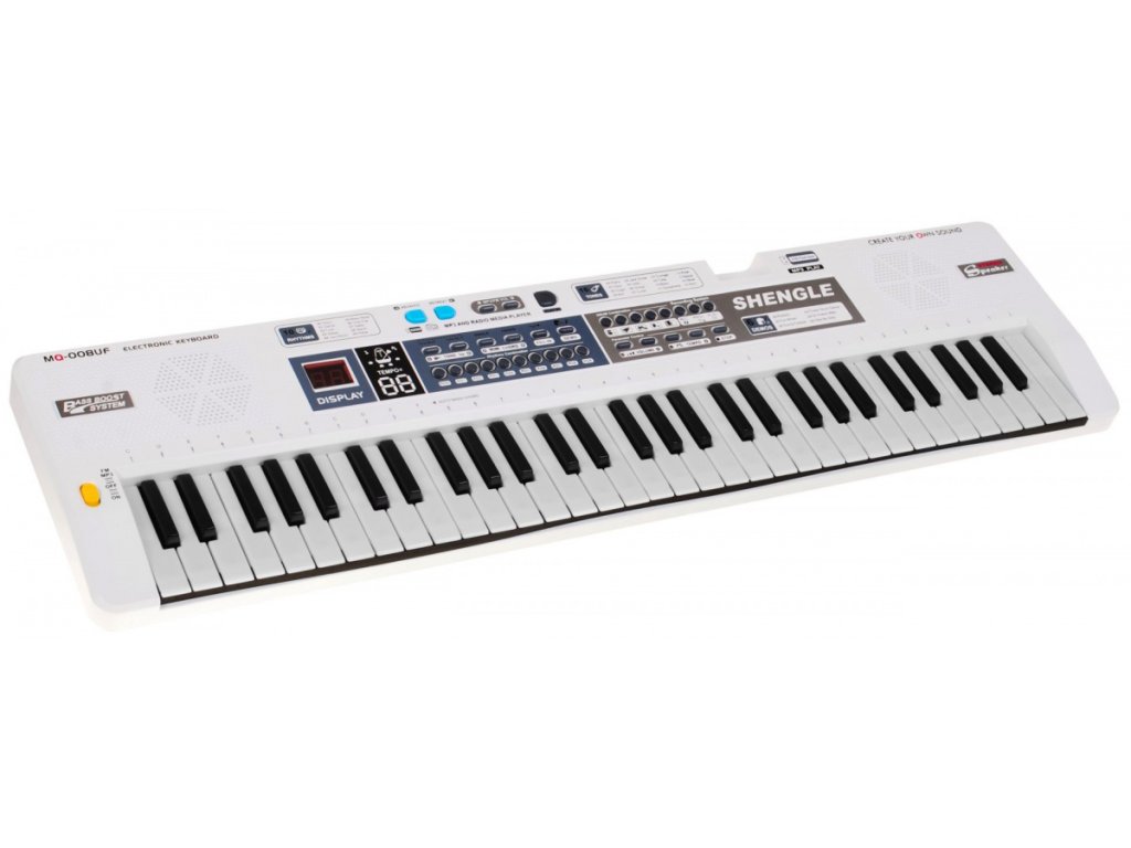 | - on / off power button, - musical keyboard (36 white keys + 25 black keys), - digital display, - 16-tone actuators (eg piano, cello, jazz guitar, trumpet, saxophone, flute, oboe ...), - buttons that activate 10 rhythms (eg waltz, tango, ballad, disco, country, rumba ...), - actuation buttons for 5 types of drums, - radio button and button for searching for radio stations, - volume control buttons, - tempo adjustment buttons, - start / stop button, - recording button, - PLAY button, - Microphone output - entry for headphones, - MP3 input, - USB port, - 2 loudspeakers, - Power Supply. |