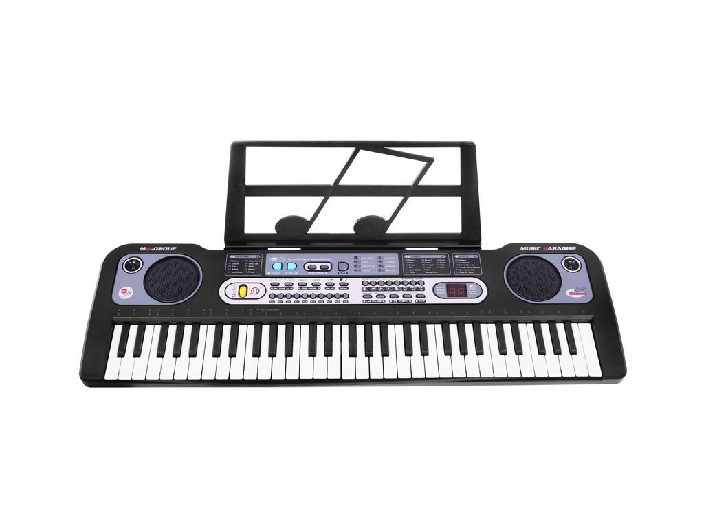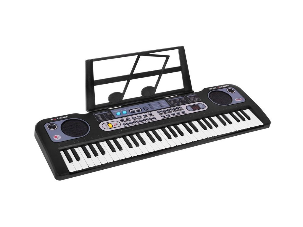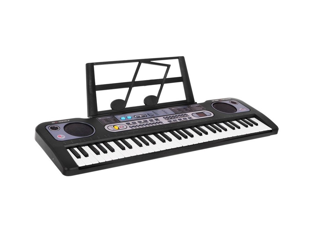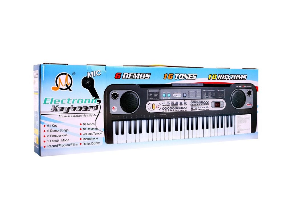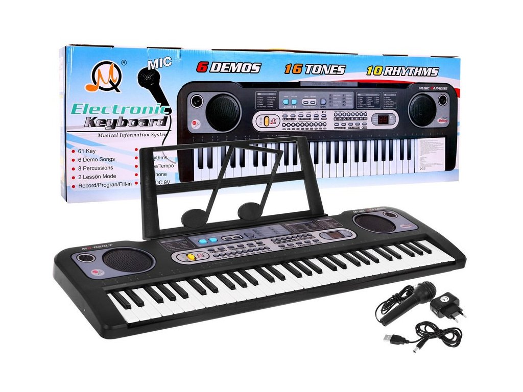 - musical keyboard (61 keys - 36 white and 25 black), - on / off power button, - digital display, - actuation buttons 16 tones (eg piano, cello, jazz guitar, trumpet, saxophone, flute, oboe ...), - buttons that activate 10 rhythms (eg waltz, tango, ballad, disco, country, rumba ...), - buttons for activating the types of drums, - radio, - volume control buttons, - tempo adjustment buttons, - start / stop button, - recording button, - PLAY button, - Microphone output - MP3 input, - USB port, - loudspeaker - Power Supply. Power supply (changeable): - network - power supply attached to the keyboard, - six 1.5V AA batteries (ordinary sticks - not included). | |