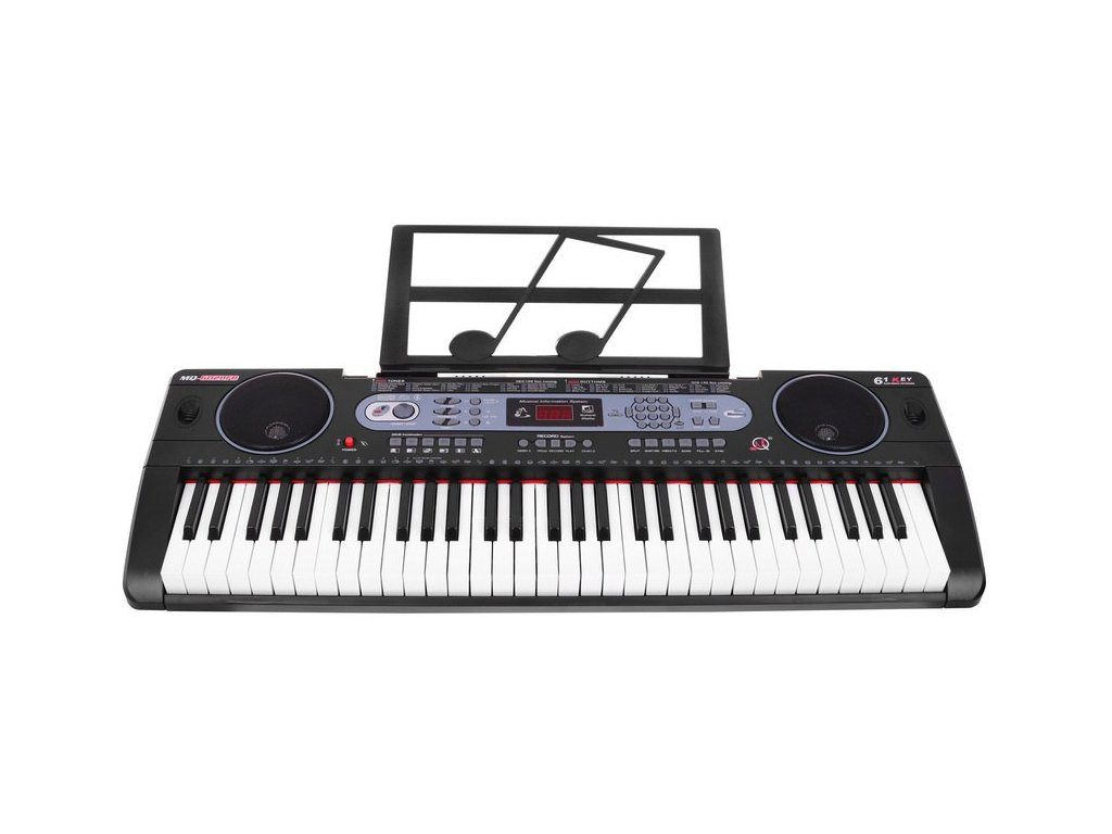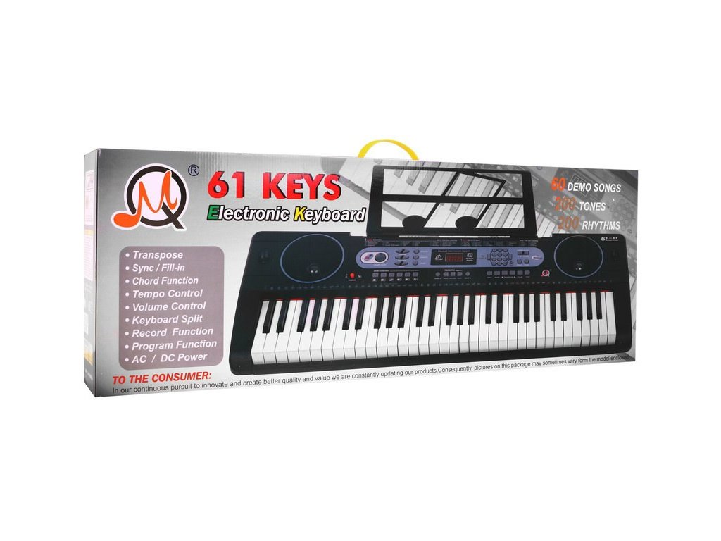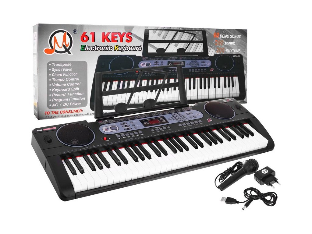 | - musical keyboard (61 keys - 36 white and 25 black), - on / off power button, - digital display, - 200 ton actuators, - buttons that activate 200 rhythms, - buttons for activating the types of drums, - radio, - volume control buttons, - tempo adjustment buttons, - start / stop button, - recording button, - Bluetooth mode, - DEMO button, - PLAY button, - Microphone output - entry for headphones, - MP3 input, - USB port, - loudspeakers (stereo), - Power Supply. Instrument power (interchangeable): - network - power supply attached to the keyboard, - six 1.5V AA batteries (ordinary sticks - not included). | |