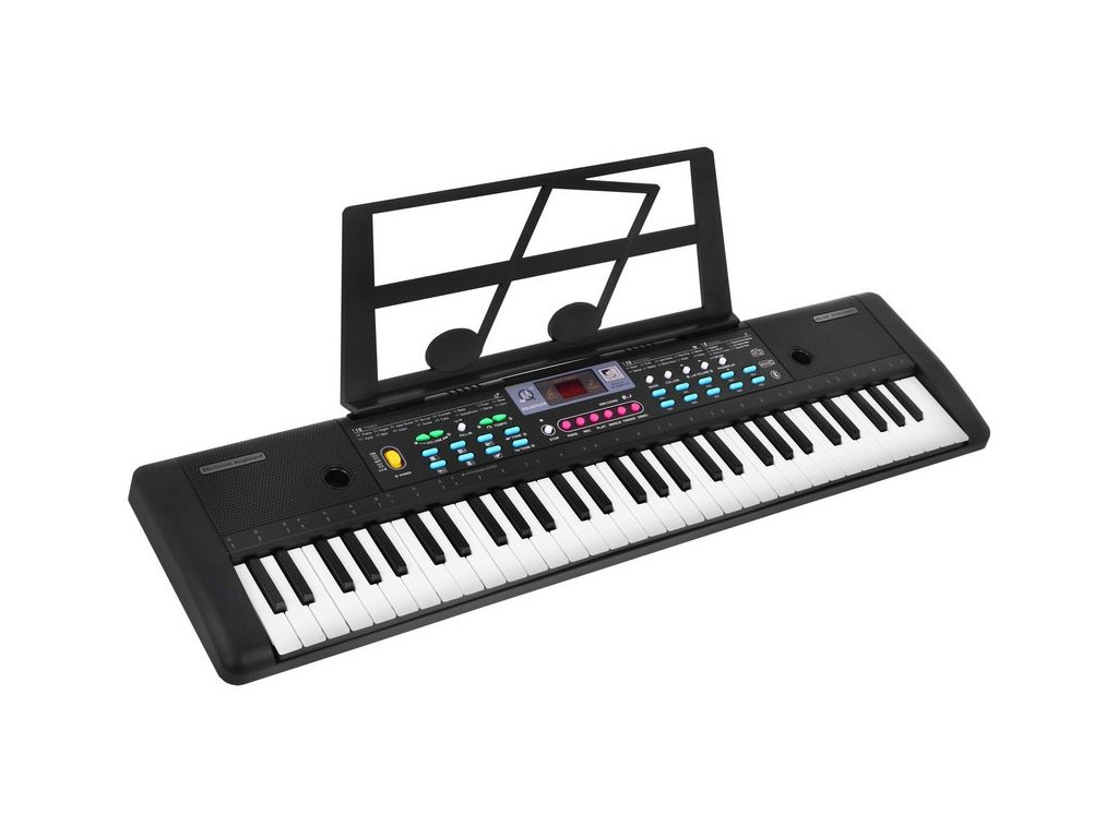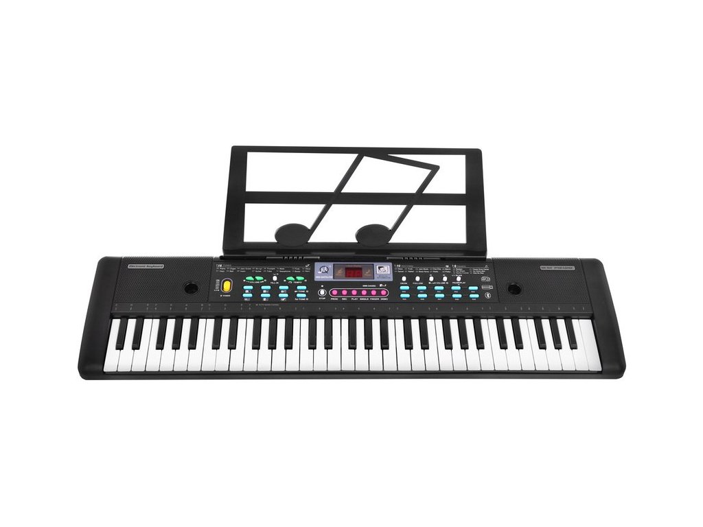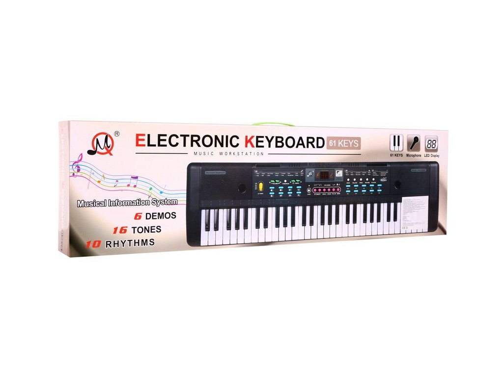 - musical keyboard (61 keys - 36 white and 25 black), - on / off power button, - digital display, - 16-tone actuators (eg piano, cello, jazz guitar, trumpet, saxophone, flute, oboe ...), - buttons that activate 10 rhythms (eg waltz, tango, ballad, disco, country, rumba ...), - buttons for activating the types of drums, - radio button and button for searching for radio stations, - bluetooth mode, - volume control buttons, - tempo adjustment buttons, - start / stop button, - recording button, - PLAY button, - Microphone output - MP3 input, - USB port, - loudspeaker - Power Supply. Power supply (changeable) - network - power supply attached to the keyboard, - six 1.5V AA batteries (ordinary sticks - not included). |