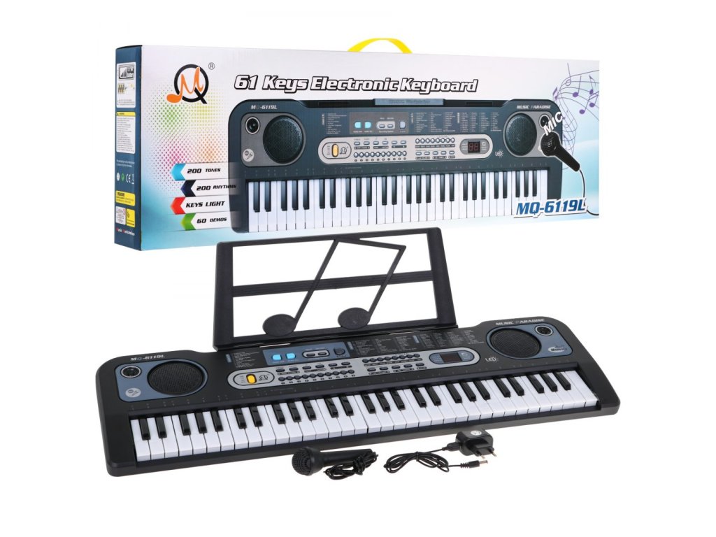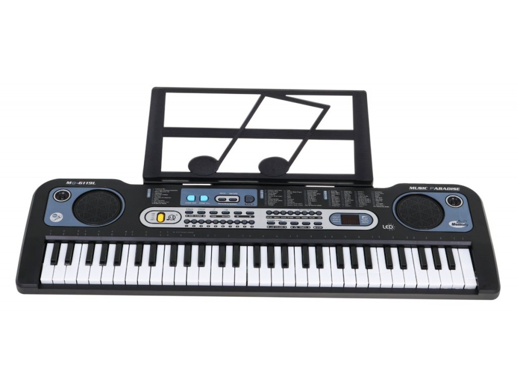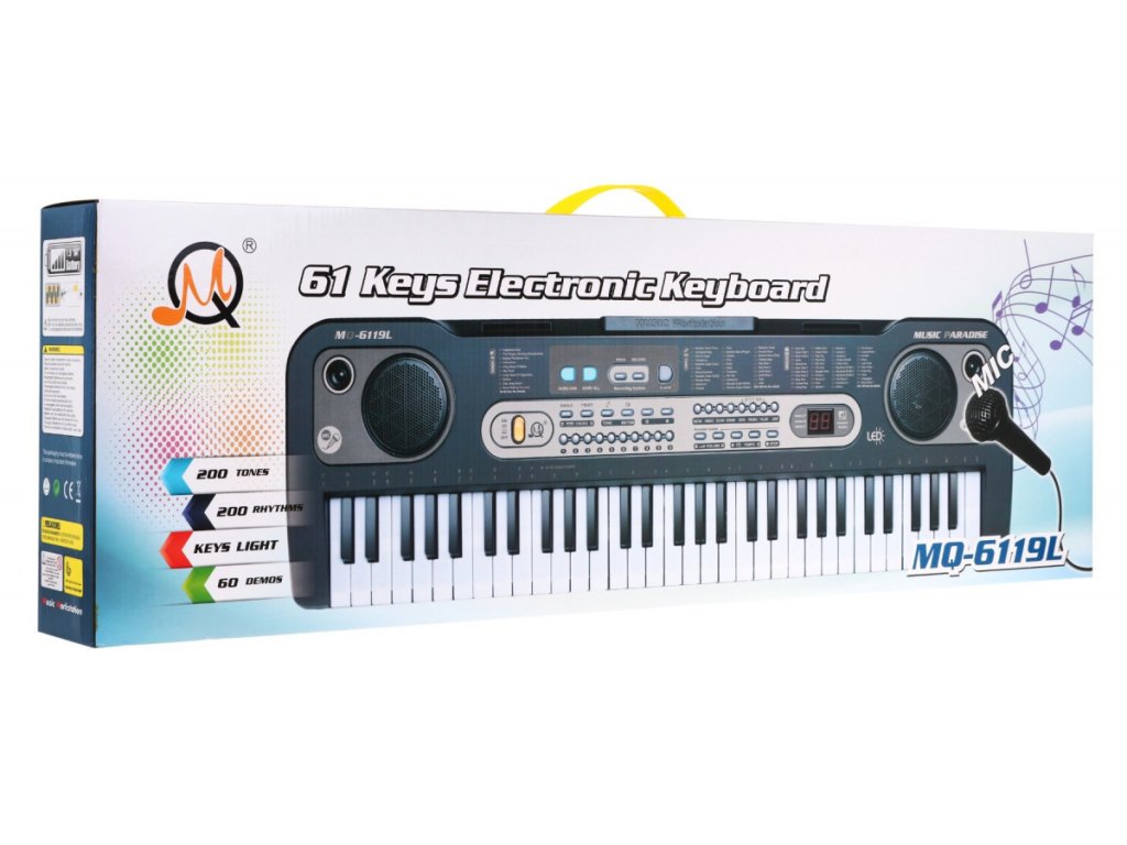 - 61 keys music keyboard (36 white, 25 black), - ON / OFF power button, - digital display, - backlit keys, - volume control, - change of pace, - 200 rhythms, - 200 tones, - 60 Demo foundations, - learning to play - LESSON button, - drums mode, - vibrato, echo function. | |