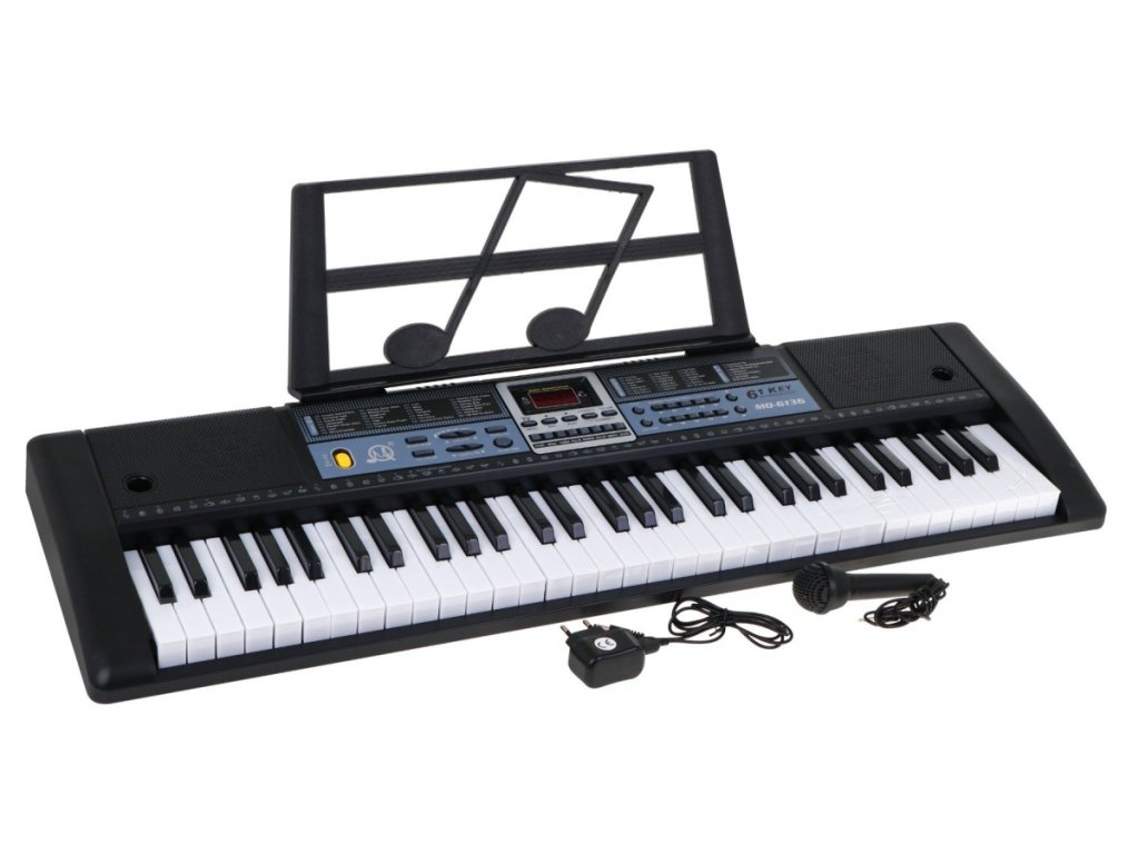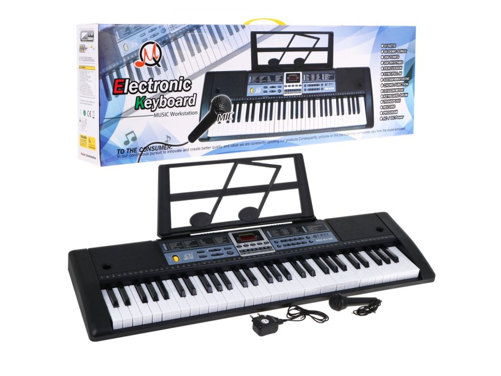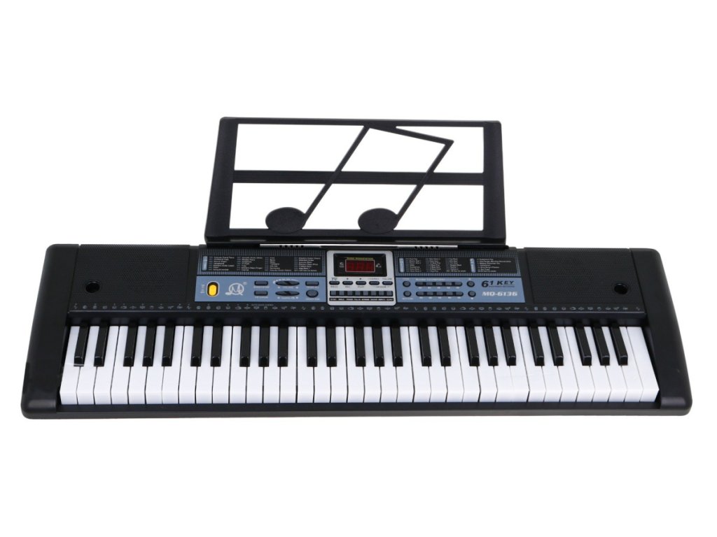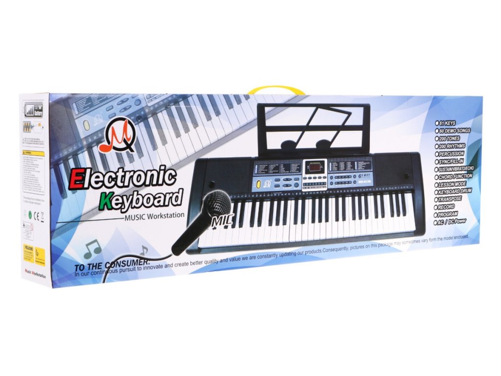 - 61 keys music keyboard (36 white, 25 black), - ON / OFF power button, - digital display, - volume control, - 200 rhythms, - STOP, START button - change of pace, - 200 tones, - recording - RECORD button, - Chord accompanying function, - 60 Demo foundations, - learning to play - LESSON button, - VIBRATO, ECHO sound effects, - METRONOME function, 4 types of tempo, - 8 drum sounds - speakers. | |