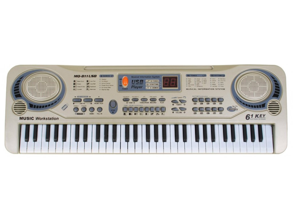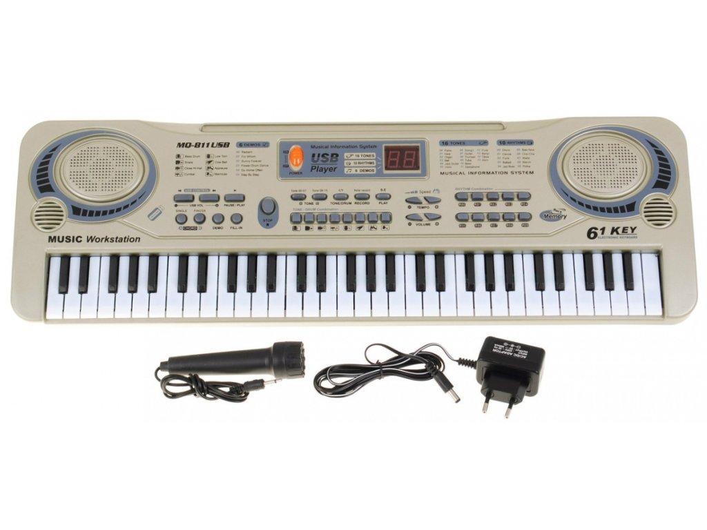 | - on / off power button, - music keyboard (36 white keys + 25 black keys), - digital display, - 16-tone actuators (eg piano, cello, jazz guitar, trumpet, saxophone, flute, oboe ...), - buttons that activate 10 rhythms (eg waltz, funk, ballad, disco, jazz ...), - buttons that activate the drums, - demo button (6 melodies), - control buttons / MP3 volume, - volume control buttons, - tempo adjustment buttons, - start / stop button, - recording button, - programming button, - S.E / PLAY button, - Microphone output - USB port, - loudspeaker - microphone - Power Supply. POWER SUPPLY OF THE INSTRUMENT (exchangeable): 1. through the network - power supply attached to the keyboard, 2. four AA 1.5V batteries (ordinary sticks) - not included. |