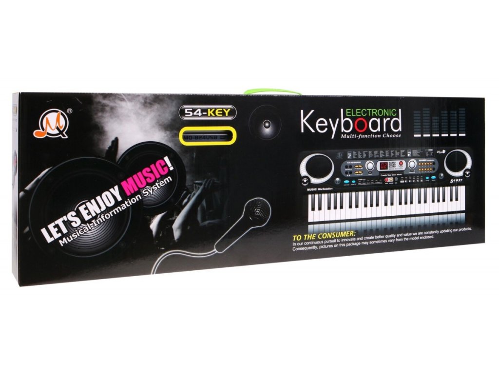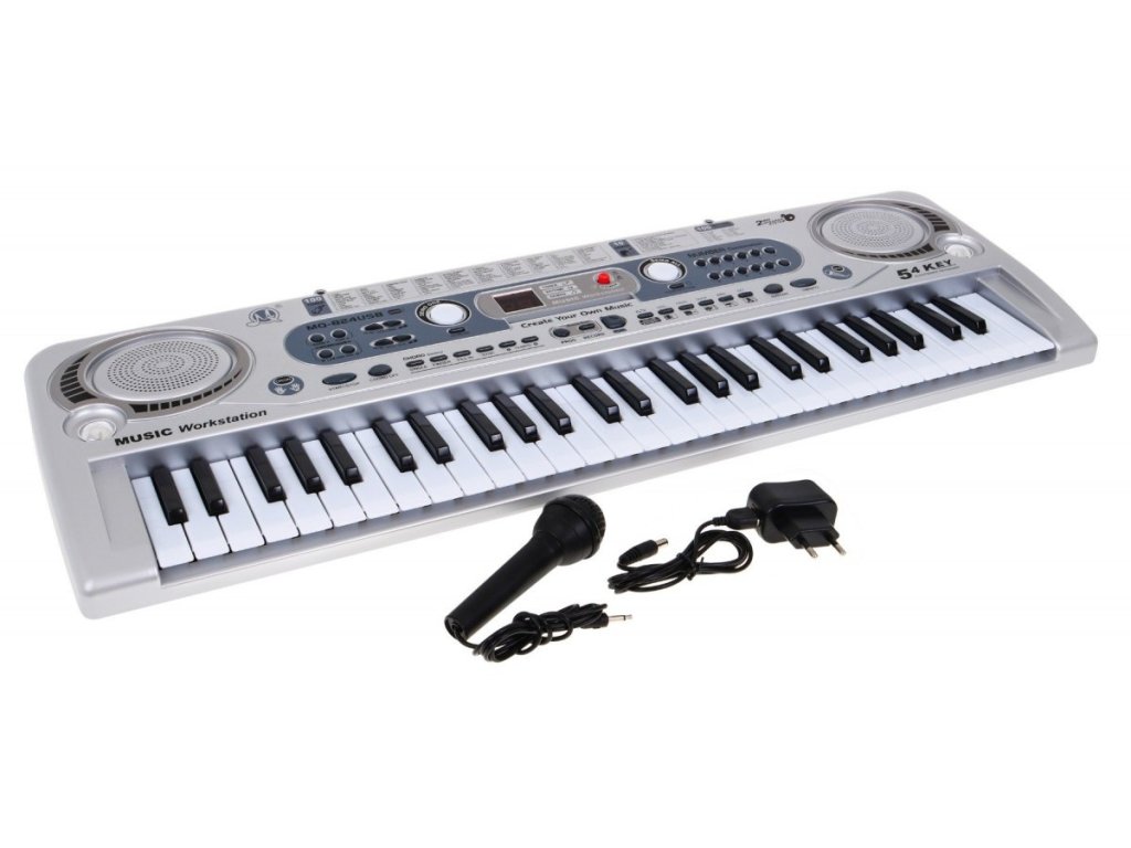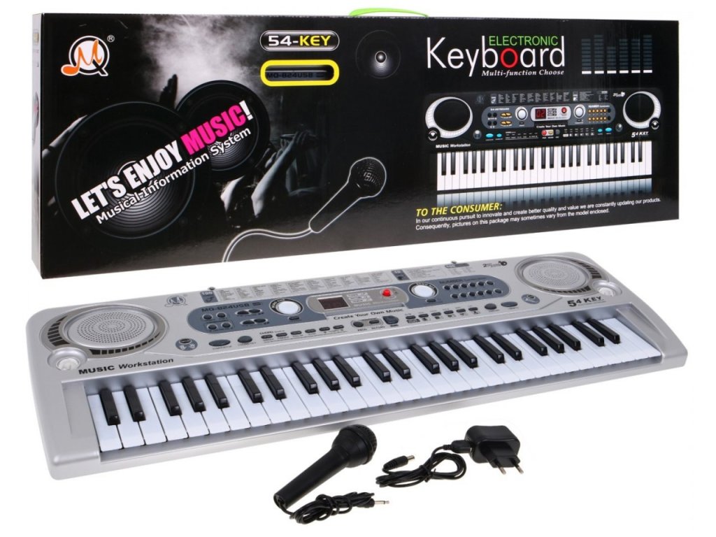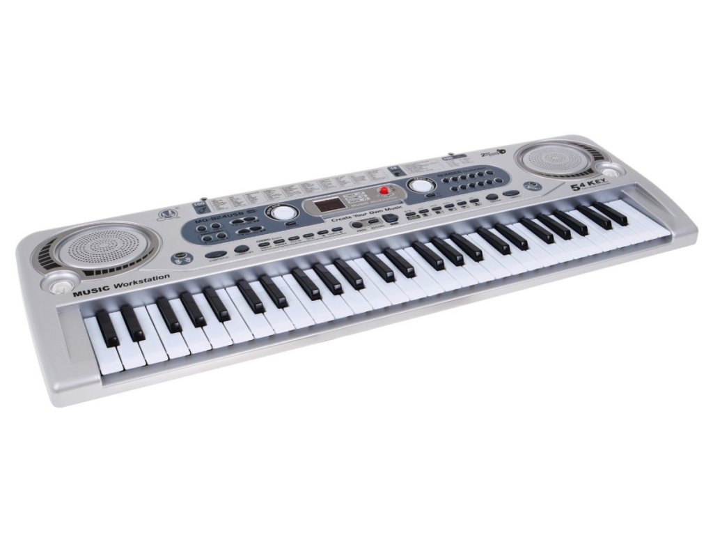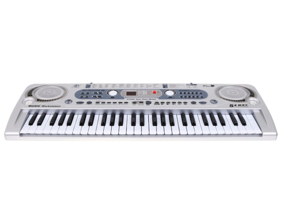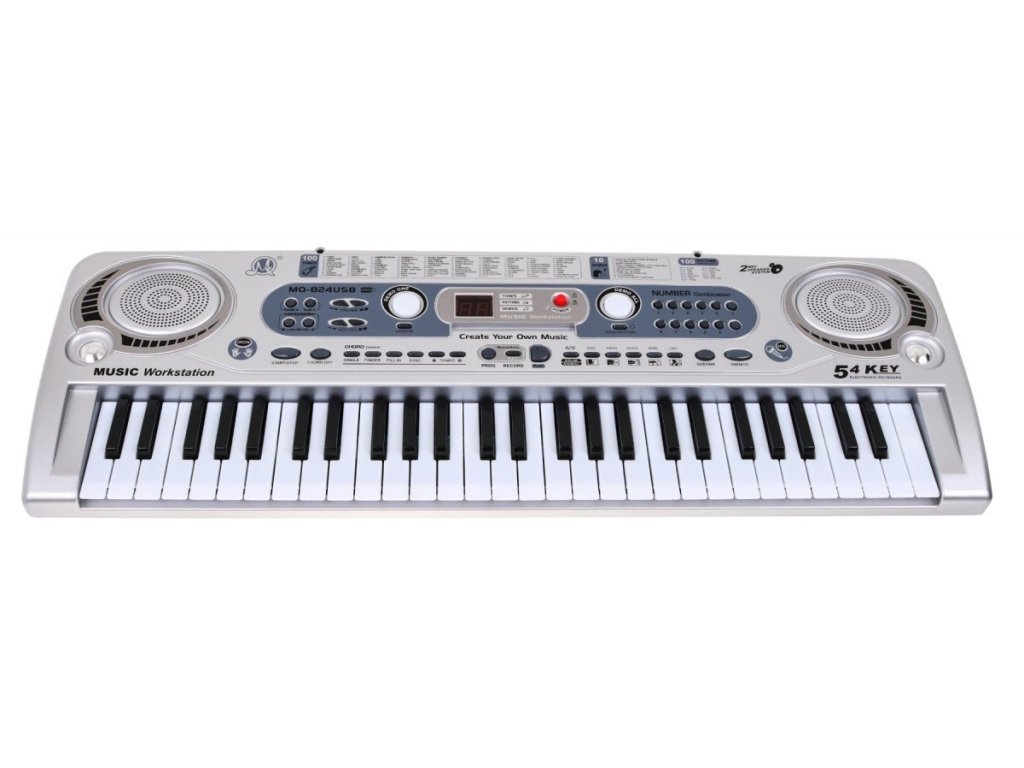 | - on / off power button, - music keyboard (32 white keys + 22 black keys), - digital display, - 100 tones actuation buttons (eg piano, cello, jazz guitar, trumpet, saxophone, flute, oboe ... -), - buttons that trigger 100 rhythms (eg waltz, tango, ballad, disco, country, rumba ...), - demo one and demo all button (10 melodies), - 5 buttons of animal sounds (male, frog, duck, bird, cat) / 5 types of drums, - chord play mode - singles (individual chords played together), finger (individual chords played separately), - volume control buttons, - tempo adjustment buttons, - start / stop button, - recording button, - programming button, - PLAY button, - Microphone output - output for an additional loudspeaker, - USB port, - 2 loudspeakers, - microphone - Power Supply. |