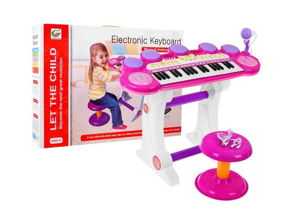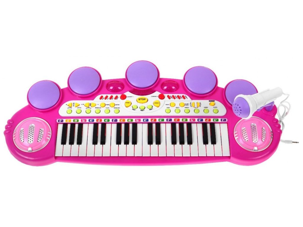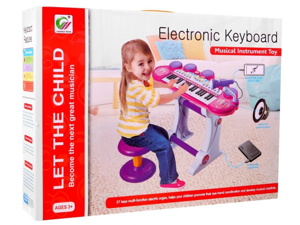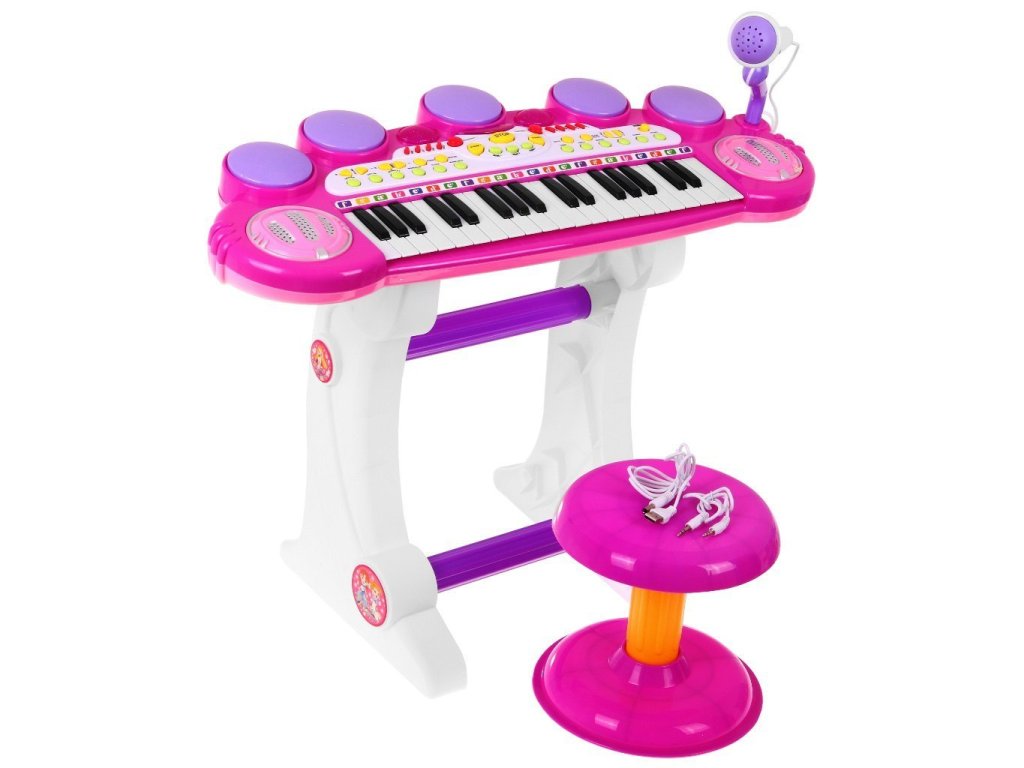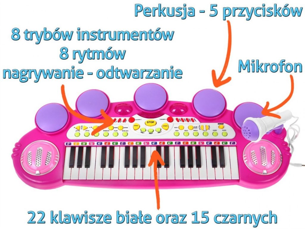 KEYBOARD HAS: - music keyboard with a range, - volume control, - Stereo speakers, - flashing set of three lights, - MP3 and telephone input - deceleration and acceleration of the rhythm, - rhythm and chord generator, - accompaniment system, - 6 kinds of disco music rites, samba, blues ..., - 5 types of snares, - additionally 8 types of instruments such as: guitar, cello, piano ..., - recording and playing sounds, - karaoke (microphone), - animal sounds. The keyboard is powered by 4 x AA 4 x 1.5V batteries (not included) or via the included USB cable. | |