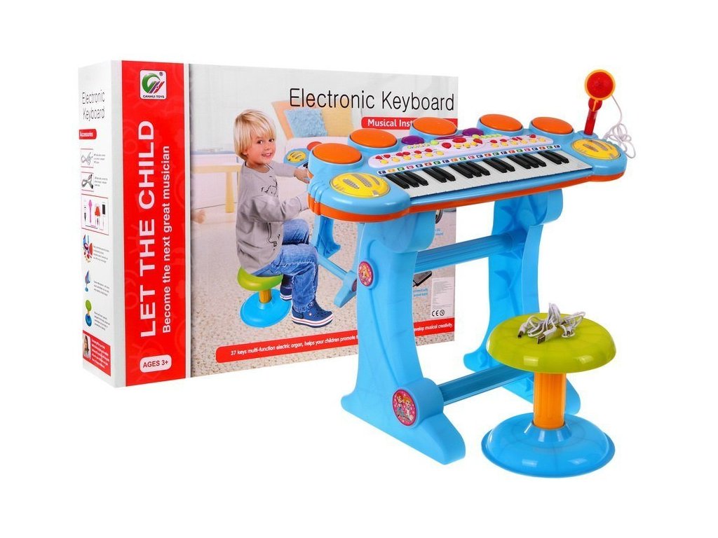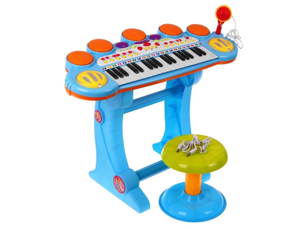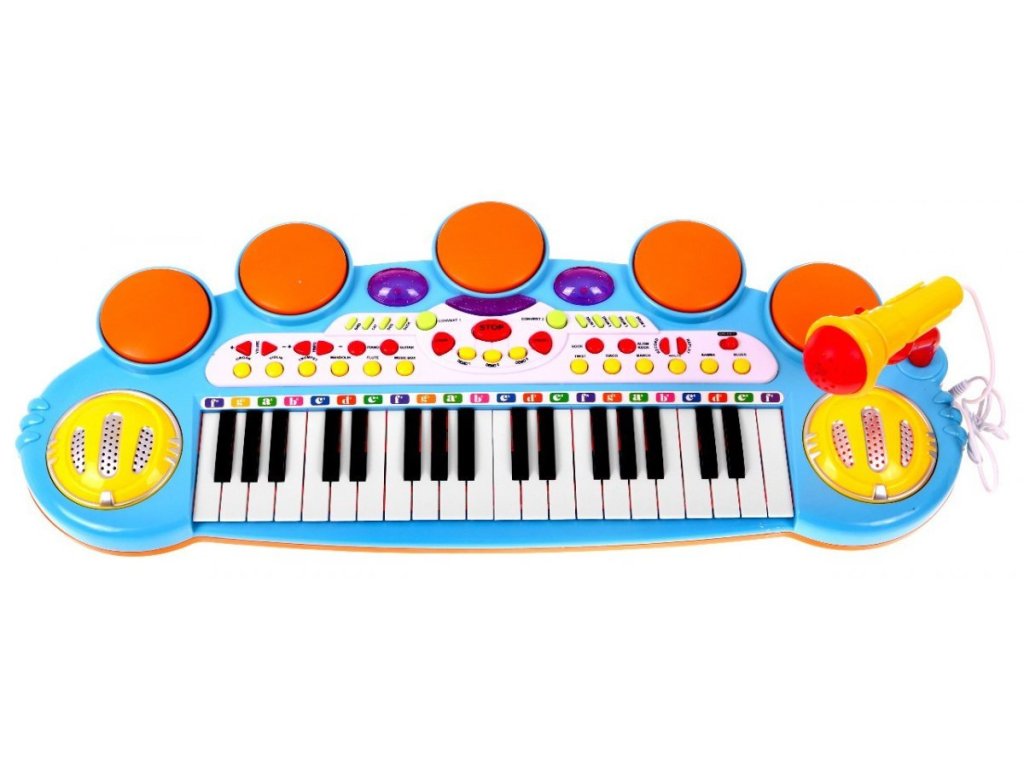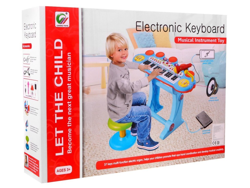 KEYBOARD HAS: - music keyboard with a range, - volume control, - Stereo speakers, - flashing set of three lights, - MP3 and telephone input - deceleration and acceleration of the rhythm, - rhythm and chord generator, - accompaniment system, - 6 kinds of disco music rites, samba, blues ..., - 5 types of snares, - additionally 8 types of instruments such as: guitar, cello, piano ..., - recording and playing sounds, - karaoke (microphone), - animal sounds. The keyboard is powered by 4 x AA 4 x 1.5V batteries (not included) or via the included USB cable. | |