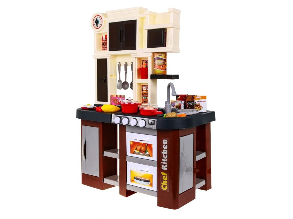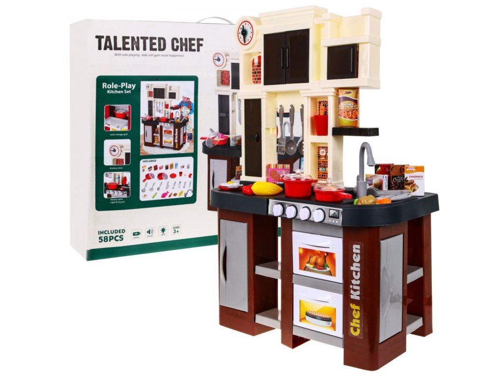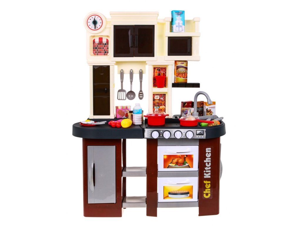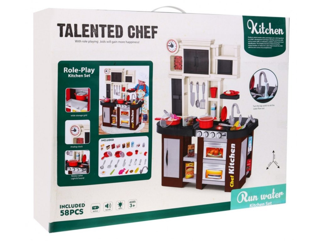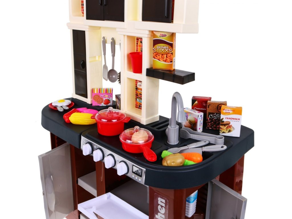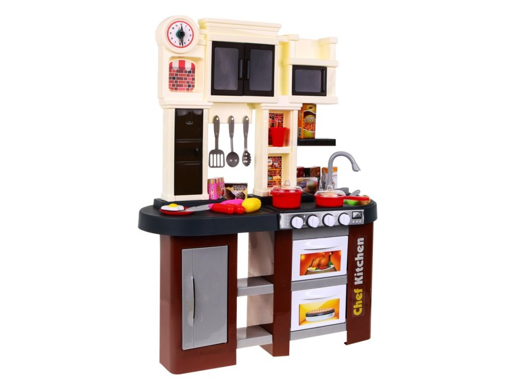 | High-quality, large interactive kitchen with real running tap water, lights and sounds of cooking and frying. The set will surely appeal to every little chef. A toy ideal for both boy and girl. The toy is intended for children from 3 years old and has the CE certificate. The toy is powered by 3 x AA batteries (not included). Description of kitchen functions: 1. Burners, when turned, make noises (cooking, frying). 2. Burners light up when cooking. 3. Clock with moving hands. 4. A tap with real water. 5. Possibility to open the oven, cabinets, fridge. The set consists of 58 elements. |