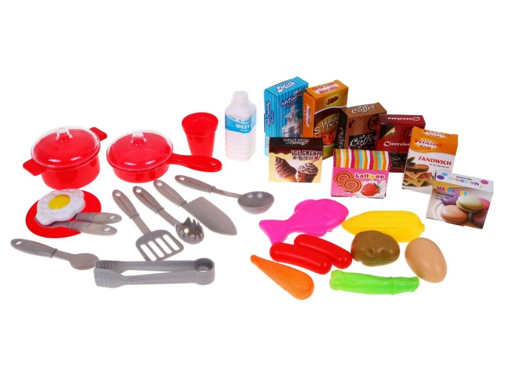 - kitchen with tap, oven, shelves, cooking hob, cabinets, - stickers for self-decorating the kitchen, - frying pan with lid approx. 14 cm x 7.5 cm x 5.5 cm, - pot with lid approx. 10.5 cm x 8 cm x 6.5 cm, - a plate with a diameter of approx. 8 cm, - a cup of approx. 5 cm x 4.5 cm, - bottle approx. 8.5 cm x 3 cm, - ladle, spatula, colander, meat tongs approx. 12.5 cm x 3.5 cm, - a small fork, knife, spoon about 10 cm x 2.5 cm, - a large knife approx. 13 cm x 3.5 cm, - vegetables (cabbage, corn, potato, carrot), - fried egg, - frankfurters, - egg, - fish - boxes with cookies, coffee, chocolates, lollipops, cookies, milk, ice cream. | |