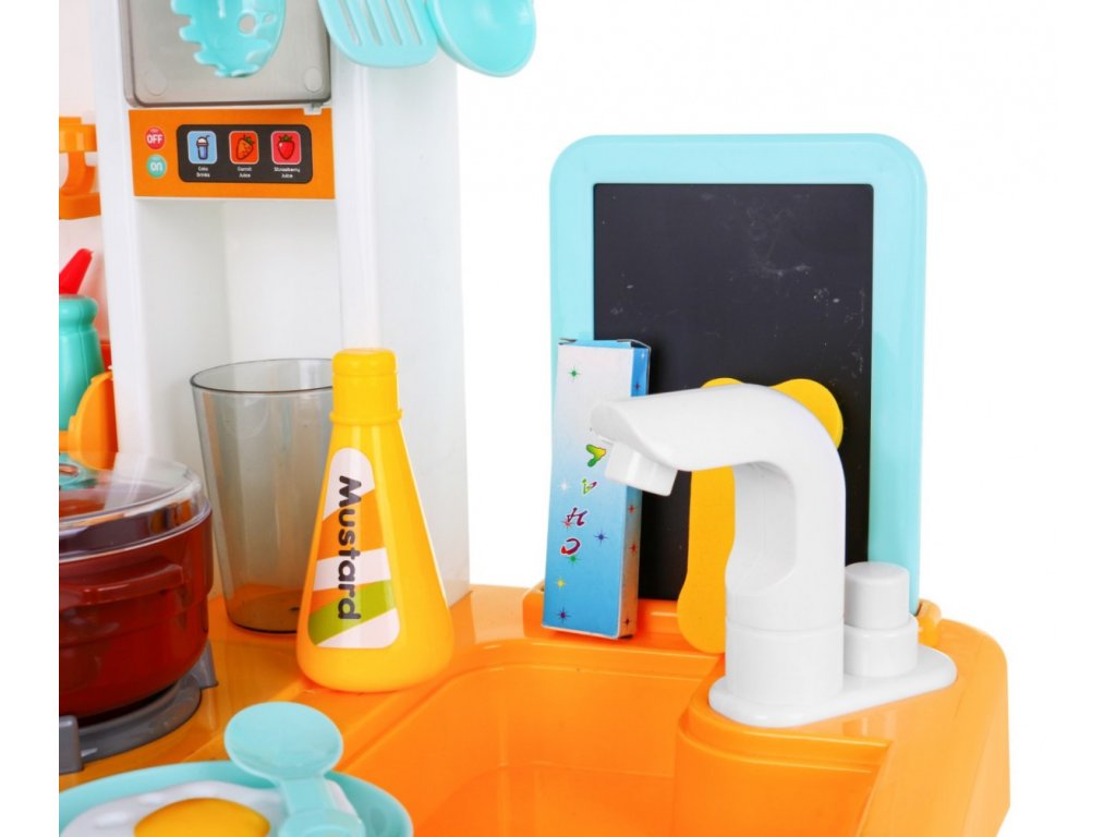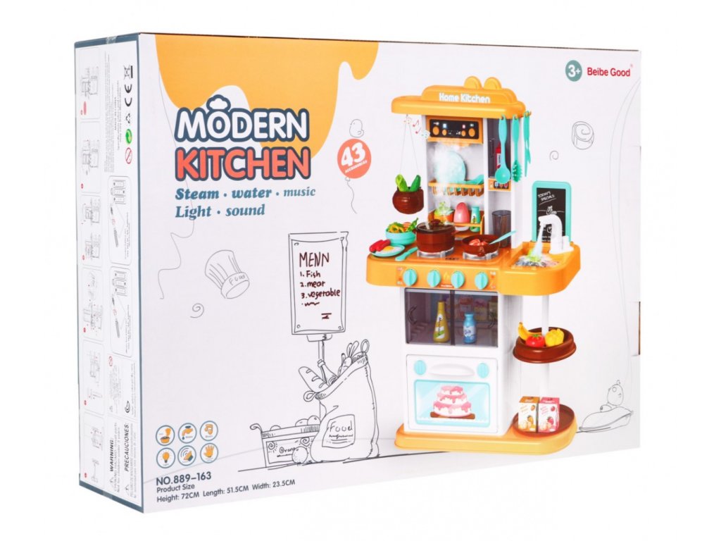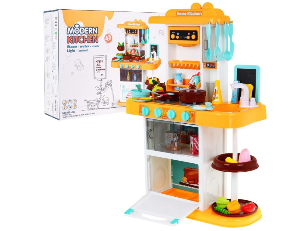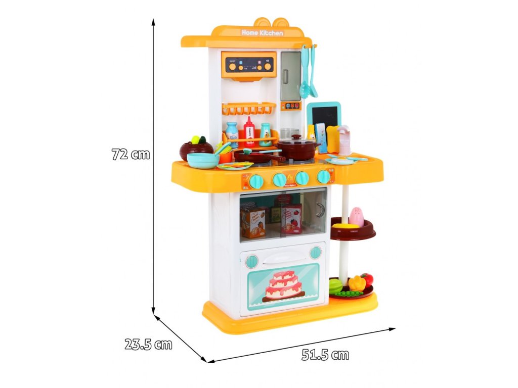 | We present you a richly equipped kitchen with many functions, distinguished by its appearance and quality of workmanship.The kitchen is a perfect gift idea, both for a boy and a girl from the age of three.It has a lot of accessories such as: cutlery, plates, pots, vegetables and fruit, food dumplings, etc. It has been enriched with sound and light effects.It has a tap with pouring water, steam function on one of the burners, illuminated burners with the sounds of frying and cooking.The set also includes a board on which your child will be able to write down a shopping list, a recipe for a favorite dish, or paint something.Under the hood there is a panel with music and blinking lights, a volume control function and the noise made by the cooker hood. The toy is powered by 6 x AA batteries (not included). |