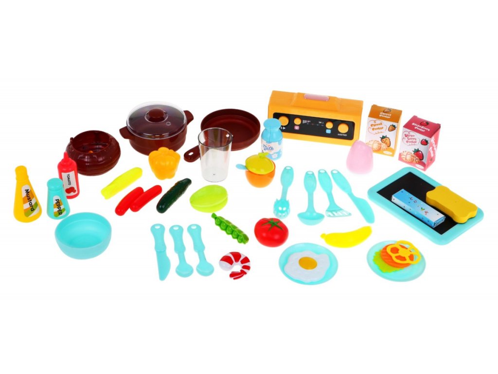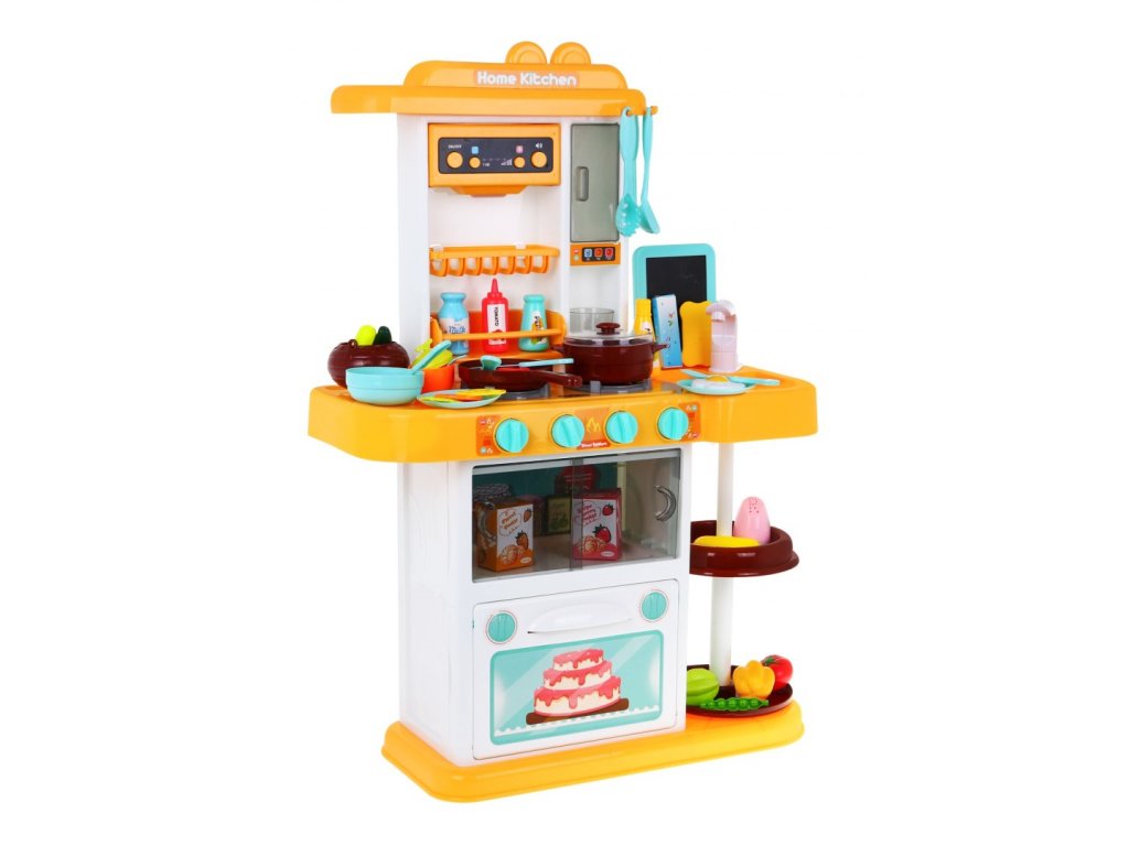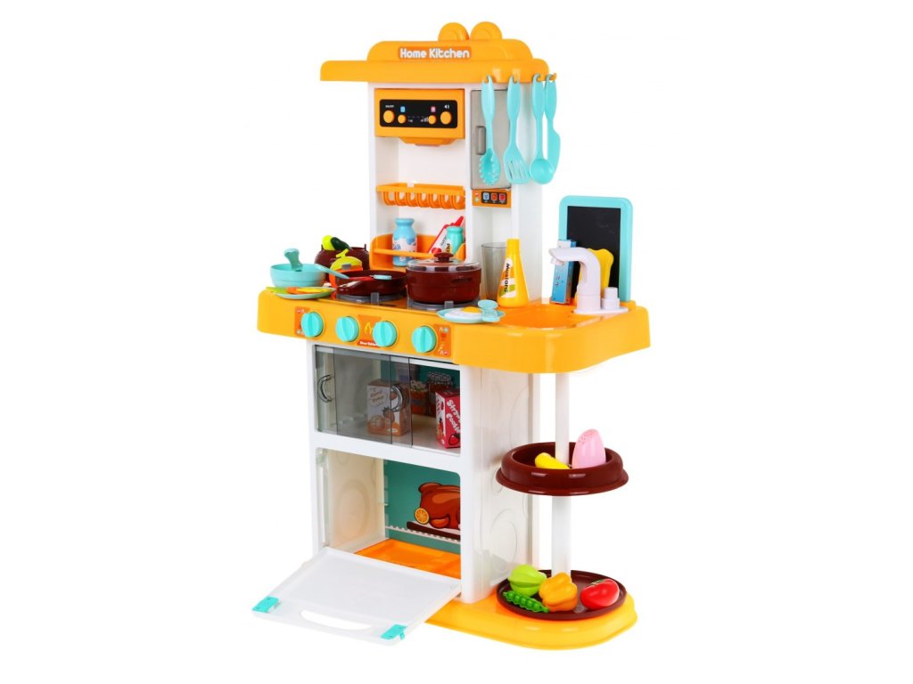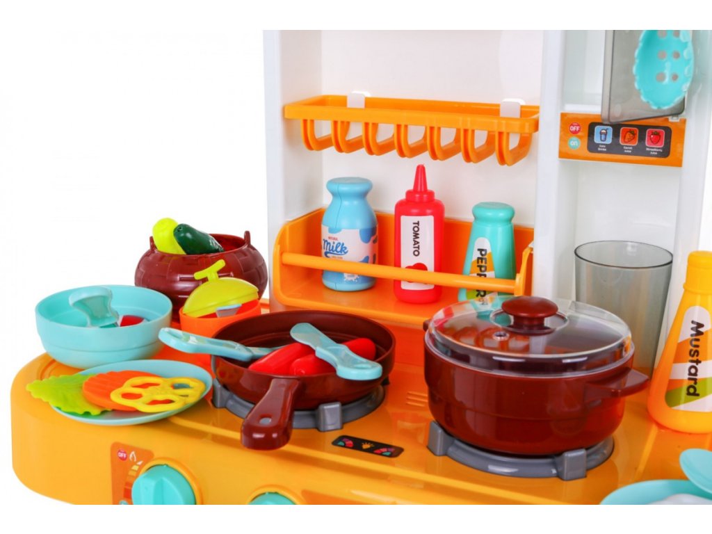 | We present you a richly equipped kitchen with many functions, distinguished by its appearance and quality of workmanship.The kitchen is a perfect gift idea, both for a boy and a girl from the age of three.It has a lot of accessories such as: cutlery, plates, pots, vegetables and fruit, food dumplings, etc. It has been enriched with sound and light effects.It has a tap with pouring water, steam function on one of the burners, illuminated burners with the sounds of frying and cooking.The set also includes a board on which your child will be able to write down a shopping list, a recipe for a favorite dish, or paint something.Under the hood there is a panel with music and blinking lights, a volume control function and the noise made by the cooker hood. The toy is powered by 6 x AA batteries (not included). |