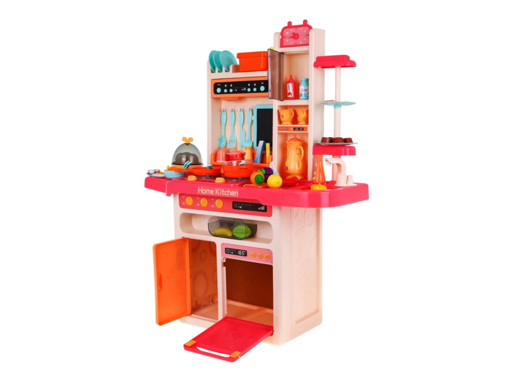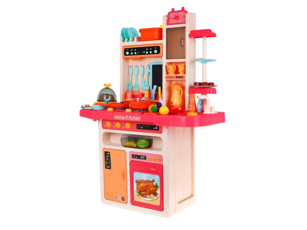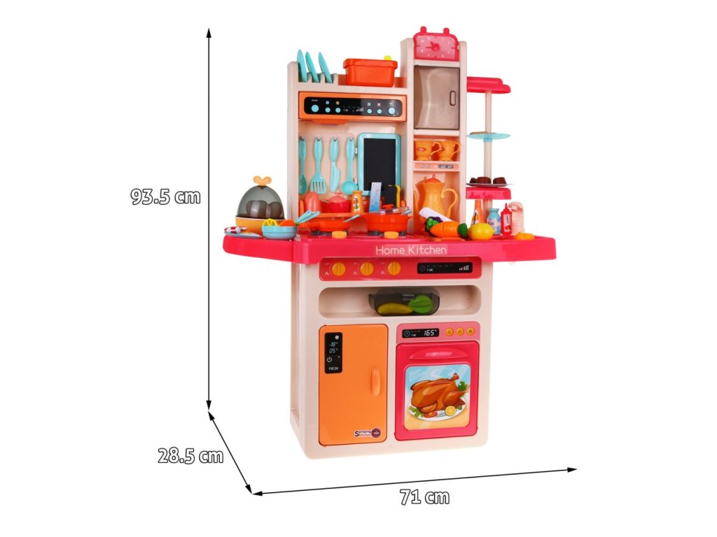 | Sensational, well-equipped, large multifunctional kitchen.The kitchen has a sink with a faucet with water, illuminated burners with the sounds of cooking and frying, one of the burners has the function of generating steam, movable knobs, hood with a lamp and music panel, an opening oven, an opening fridge, a clock, shelves and numerous accessories.kitchenware (65 elements).Kitchen accessories include min.an egg cooker that “boils” eggs, making sounds, and a blackboard with chalk and a sponge. The set is intended for children from 3 years of age and is powered by 8 x AA batteries, which are not included in the set. |