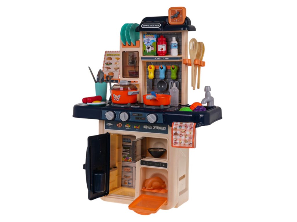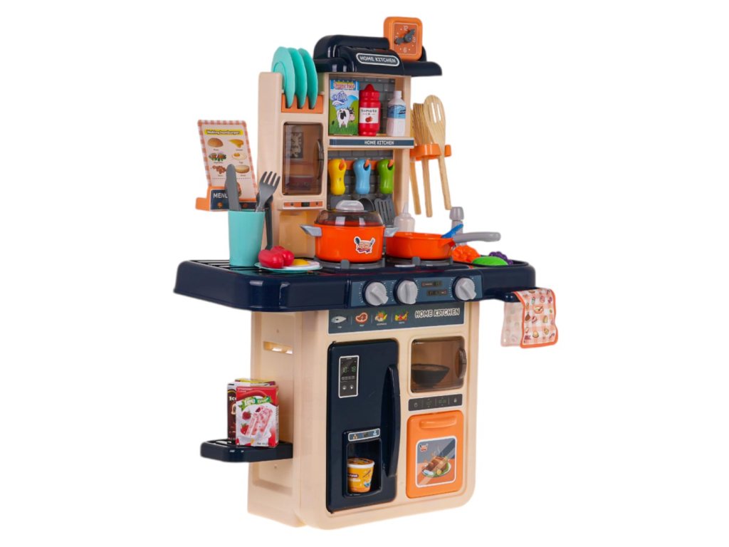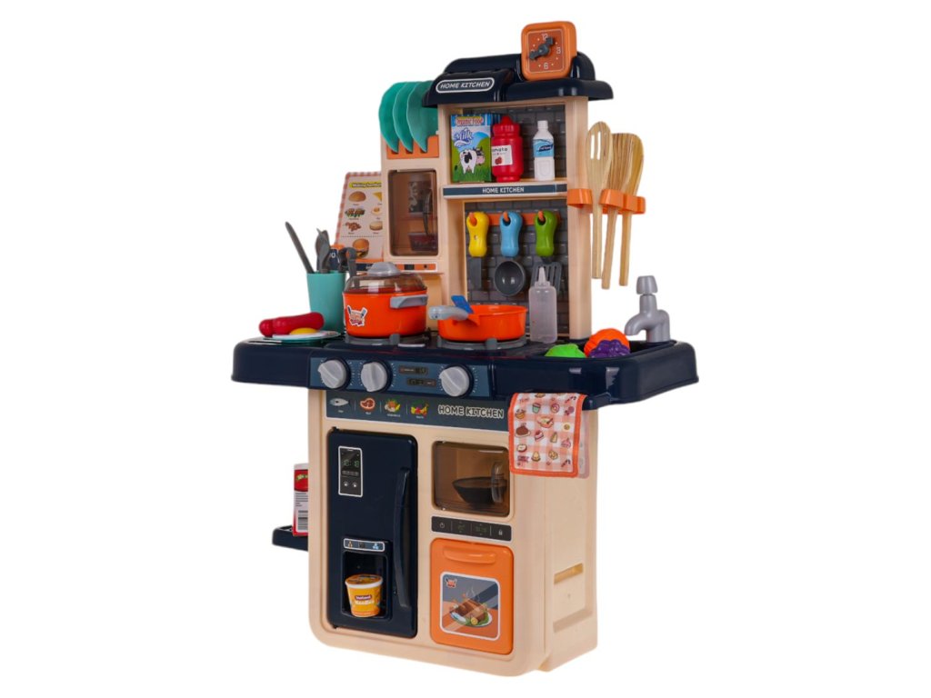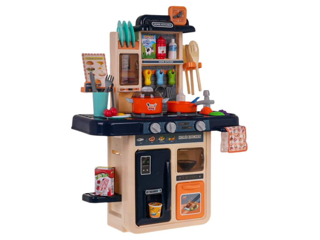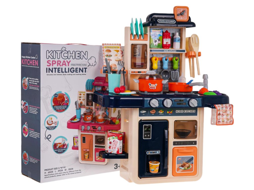 - suitable for children over 3 years of age, - made of the best quality plastic, - sound functions: frying sounds, cooking sounds, falling ice cube sounds, - light functions: illuminated burners, - steam emerging from one of the burners, - has an opening fridge, oven, microwave, - water tap, - clock with moving hands, - lots of accessories. |