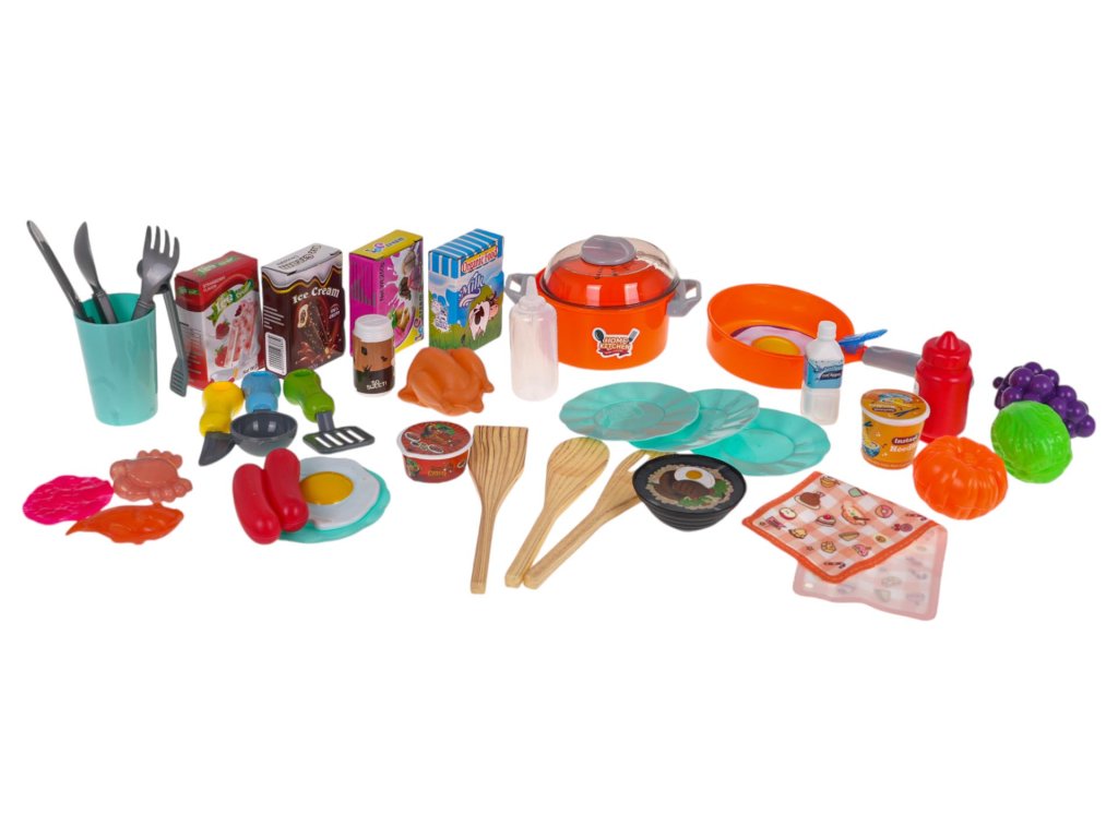 - kitchen construction elements, - pot with lid, - frying pan, - mug, - 4 x plate, - cutlery: knife, fork, spoon, - ladle, spatula, cleaver, - tongs, - 3 x large spatula, - a bowl, - food products: pumpkin, lettuce, crab, chicken, 2 x fried eggs, grapes, fish, sausages, ketchup, cartons of cookies, milk and ice cream, chocolate milk, instant soup, - menus, - cloth, - water pipette, - decorative stickers. |