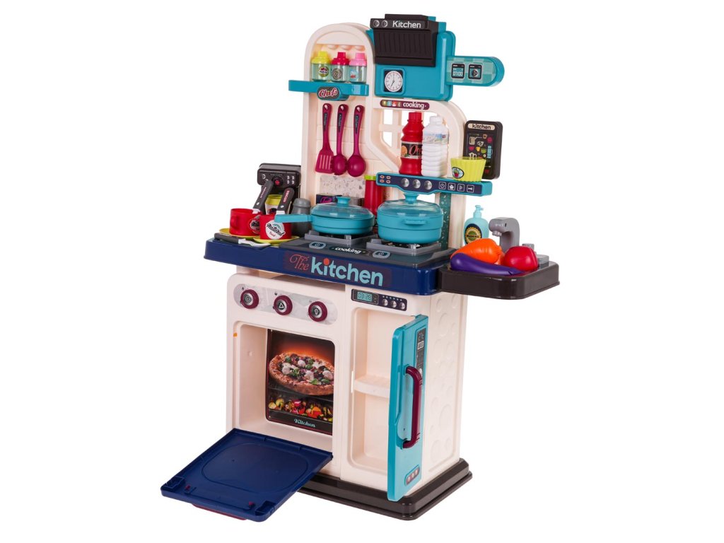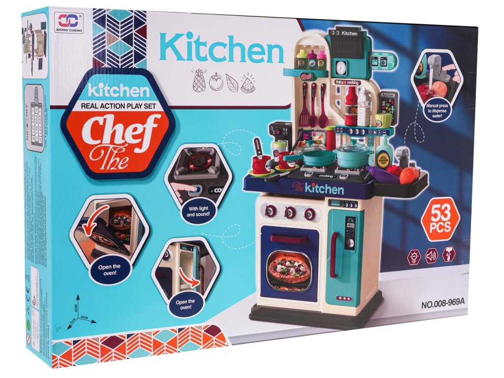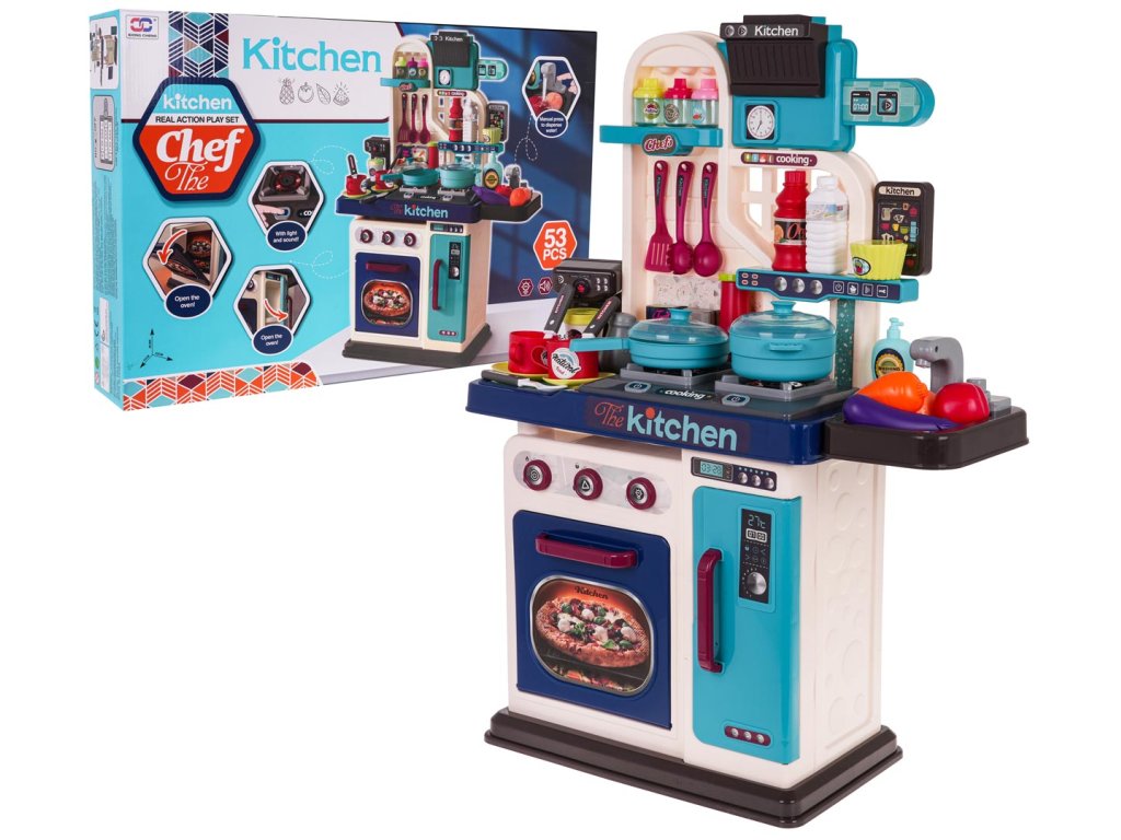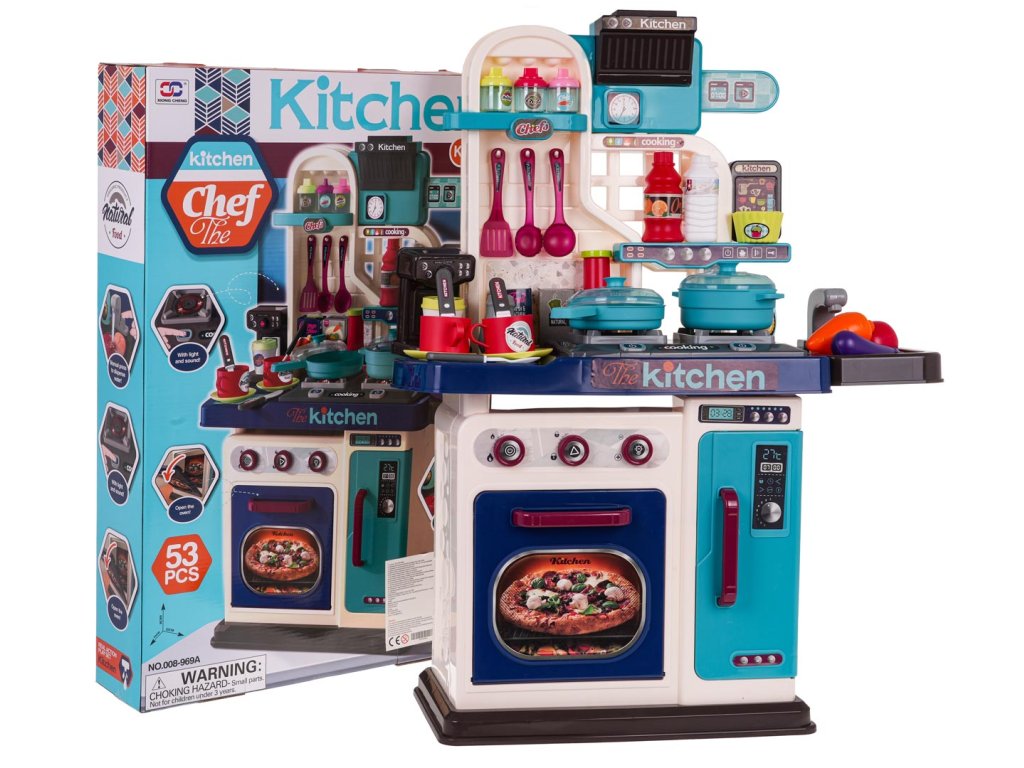 - intended for children over 3 years of age, - made of the best quality plastic in vivid colors, - richly equipped with as many as 53 elements, - a tap with pouring water, - the burners are backlit, - frying and cooking sounds, - opening oven and refrigerator. |