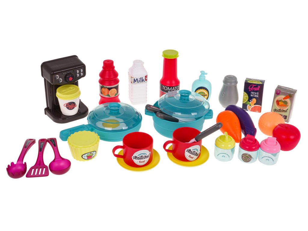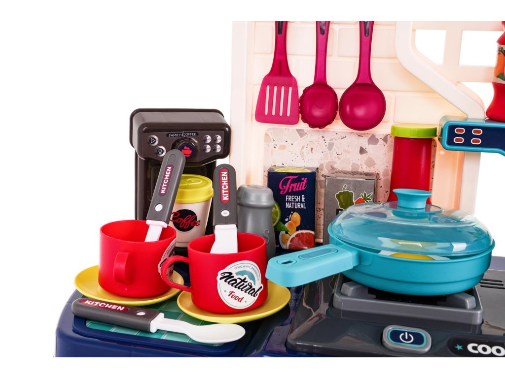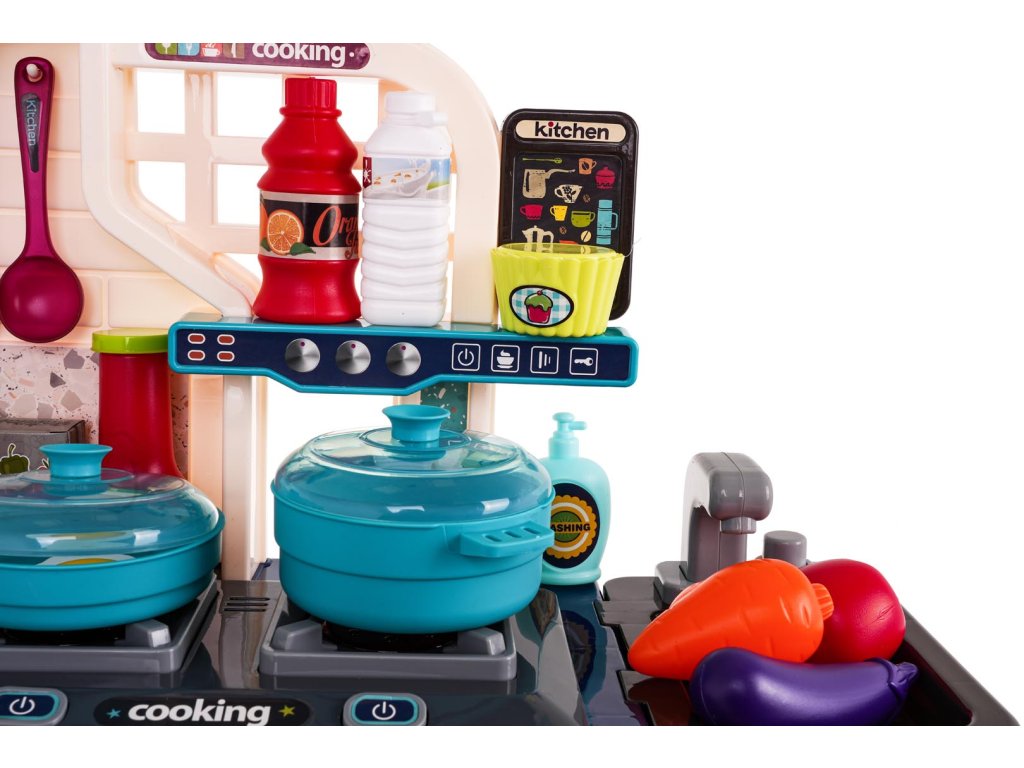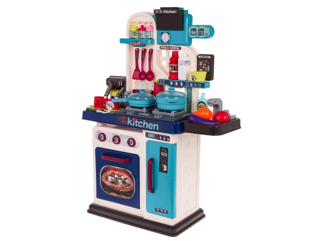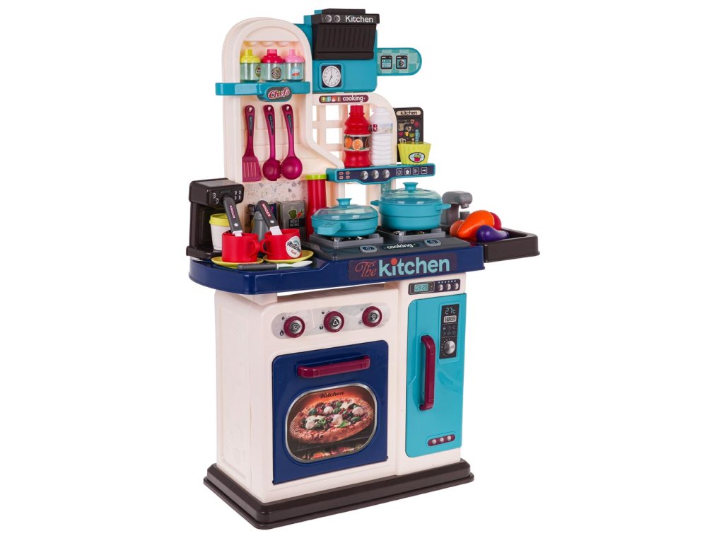 - intended for children over 3 years of age, - made of the best quality plastic in vivid colors, - richly equipped with as many as 53 elements, - a tap with pouring water, - the burners are backlit, - frying and cooking sounds, - opening oven and refrigerator. |
