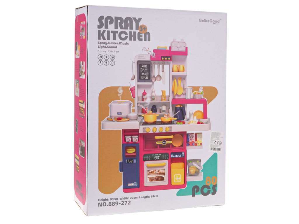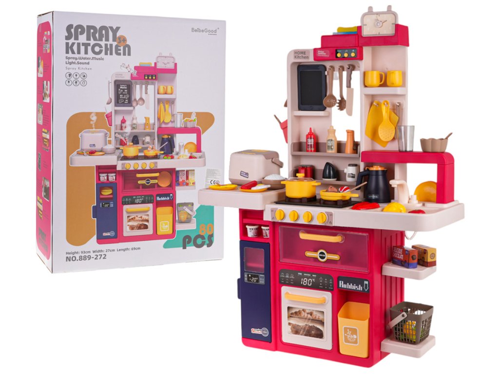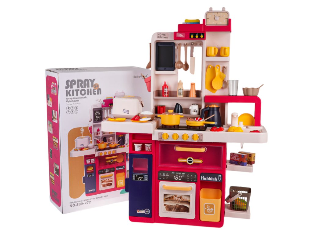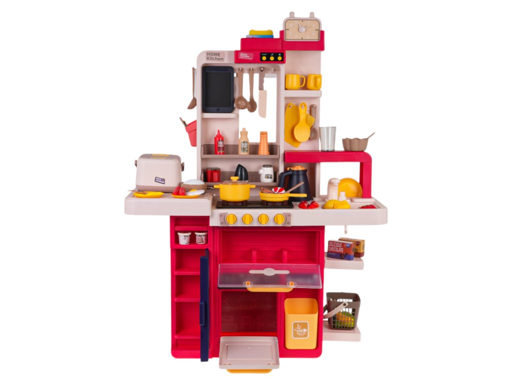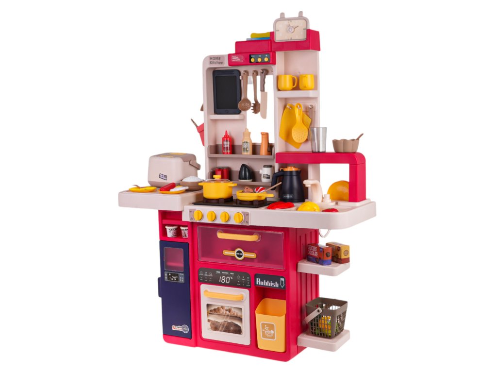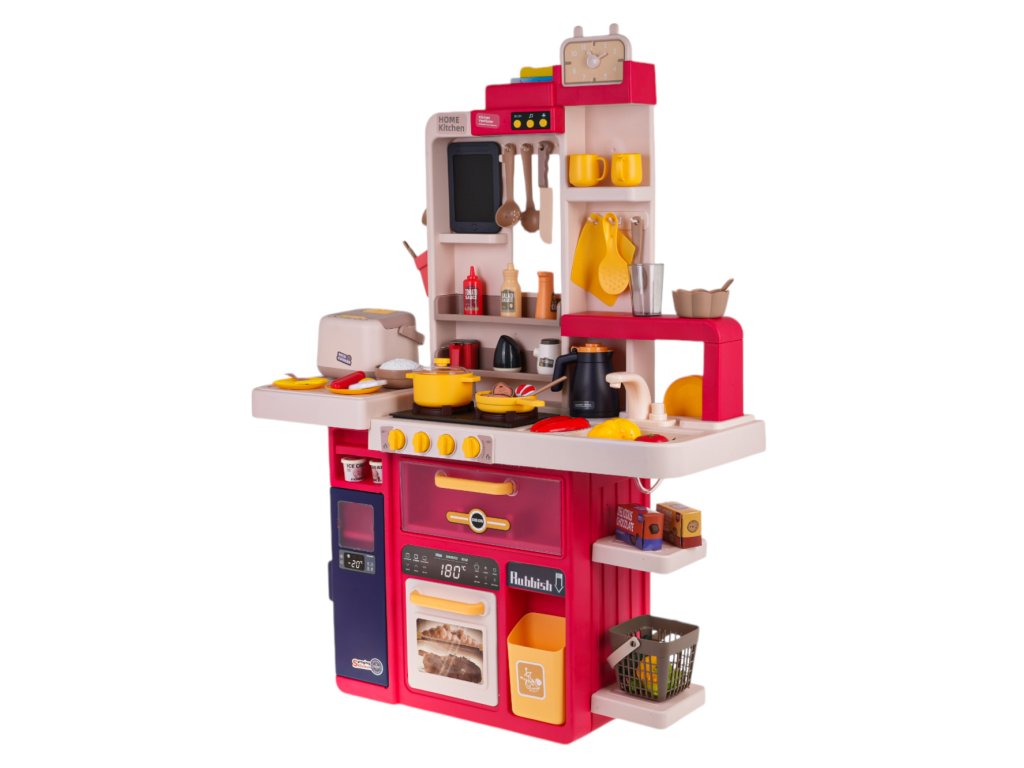 - suitable for children from 3 years of age, - made of the best quality plastic in vivid colors, - richly equipped, the set consists of as many as 80 elements, - movable knobs, - burners with backlight, - frying and cooking sounds, - safe steam escapes from the pan or pot, - Safe steam is released from the rice cooking container and cooking sounds can be heard, - a tap with running water, - opening fridge, - opening oven, - opening shelf, - clock with moving hands, - chalk board, - a panel with melodies and sounds made by the hood. |