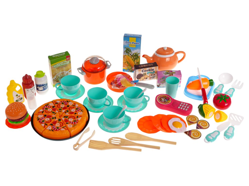 - kitchen, - telephone, - 4 x recipe cards, - chopping board, - deep pot with lid, - frying pan, - kettle with lid, - ladle, - fork, - shoulder, - a larger and smaller knife - spatula, - spoon, - 2 x teaspoon, - slotted spoon, - 2 x teaspoons, - a cup, - 4 x cup, - 4 x plates, - 4 x plates, - tongs, - 3 x coffee capsules, - ketchup bottle, - milk bottle, - oil bottle, - 2 x cornflakes in a box, - a carton of ice cream, - a box of cookies, - mock products: tomato on turnip, corn on turnip, carrot on turnip, fried egg, pizza (6 pieces on turnip), fish, crab, hamburger with lettuce and meat on turnip, - grill tray, - water pipette, - decorative stickers. |