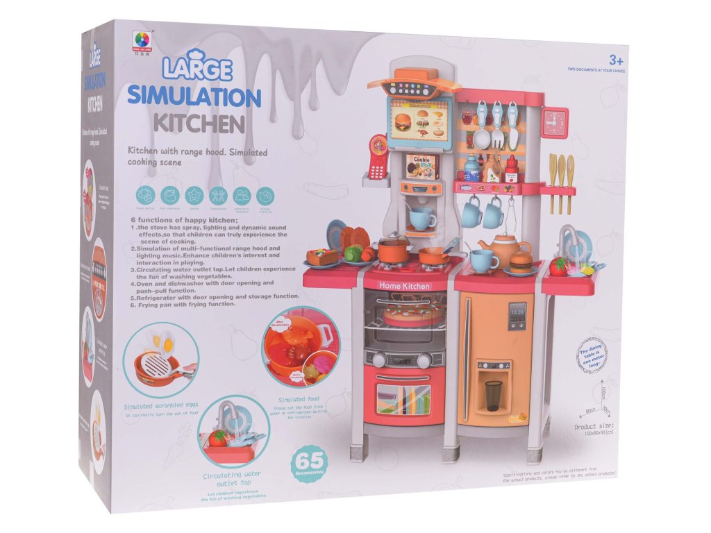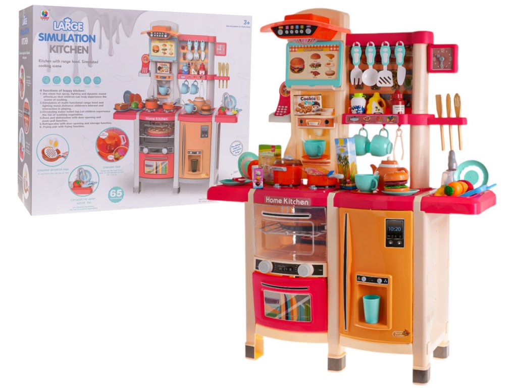 - suitable for children from 3 years of age, - made of the best quality plastic in vivid colors, - richly equipped, the set consists of as many as 65 elements, - movable knobs, - burners with backlight, - frying and cooking sounds, - a tap with running water, - opening fridge with a fake water dispenser, - opening oven with sounds and light, - opening dishwasher, - built-in coffee machine, - panel with fan, lights and sounds, - telephone with sounds (ringtones, animal sounds, song) and illuminated antenna, - frame for recipe cards, - clock with moving hands, - 3 products (fish, crayfish, piece of meat) change color when placed in the pressure cooker. |