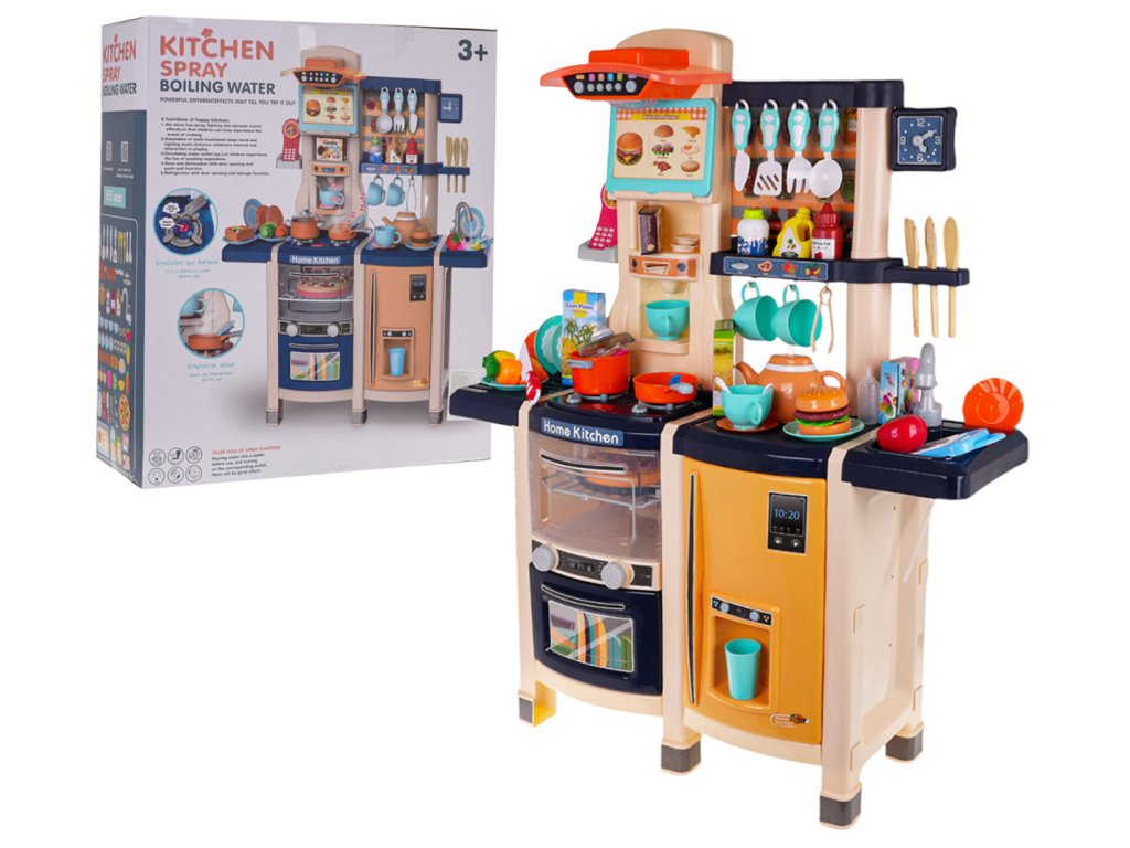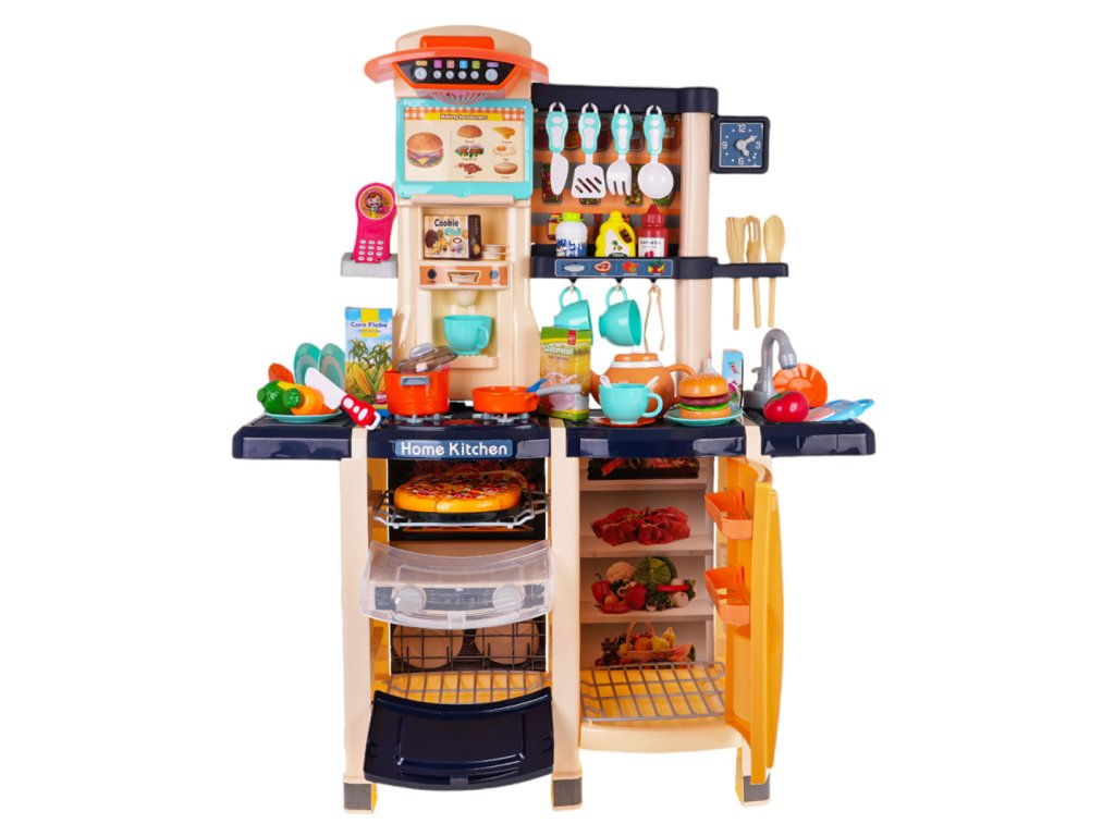 - suitable for children from 3 years of age, - made of the best quality plastic in vivid colors, - richly equipped, the set consists of as many as 65 elements, - movable knobs, - burners with backlight, - frying and cooking sounds, - a tap with running water, - opening fridge with a fake water dispenser, - opening oven with sounds and light, - opening dishwasher, - built-in coffee machine, - panel with fan, lights and sounds, - telephone with sounds (ringtones, animal sounds, song) and illuminated antenna, - frame for recipe cards, - clock with moving hands, -battery-powered pressure cooker that produces bubbles in the water and cooking sounds, - 3 products (fish, crayfish, piece of meat) change color when placed in the pressure cooker. |