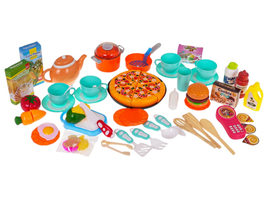- kitchen, - telephone, - 4 x recipe cards, - chopping board, - deep pot with lid, - frying pan, - kettle with lid, - ladle, - fork, - shoulder, - a larger and smaller knife - spatula, - spoon, - 2 x teaspoon, - slotted spoon, - 2 x teaspoons, - a cup, - 4 x cup, - 4 x plates, - 4 x plates, - tongs, - 3 x coffee capsules, - ketchup bottle, - milk bottle, - oil bottle, - 2 x cornflakes in a box, - a carton of ice cream, - a box of cookies, - mock products: tomato on turnip, corn on turnip, carrot on turnip, fried egg, pizza (6 pieces on turnip), fish, crab, hamburger with lettuce and meat on turnip, - grill tray, - water pipette, - decorative stickers. |