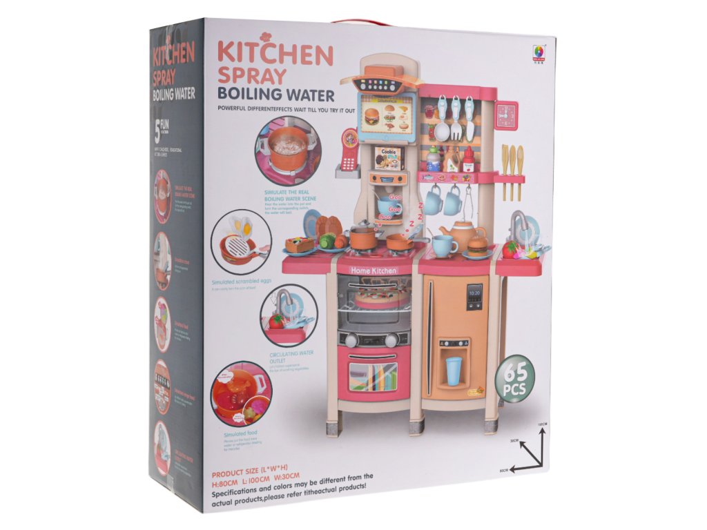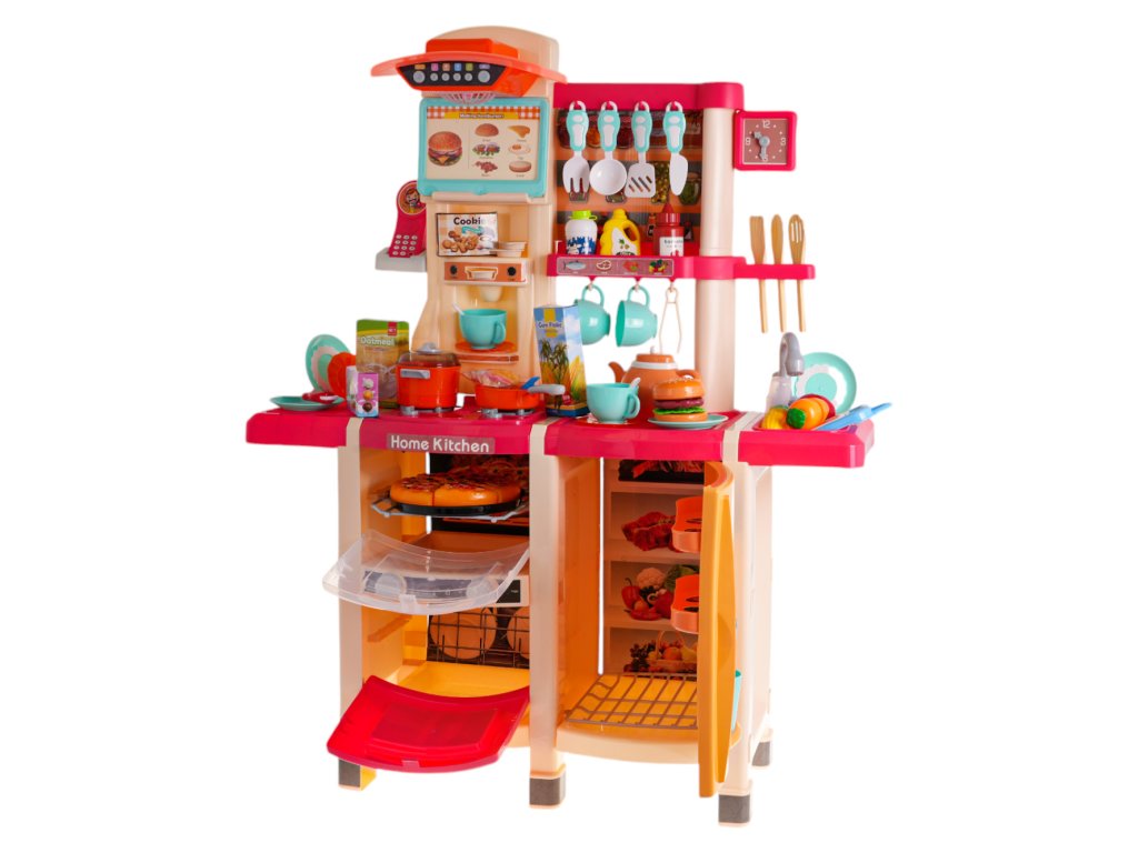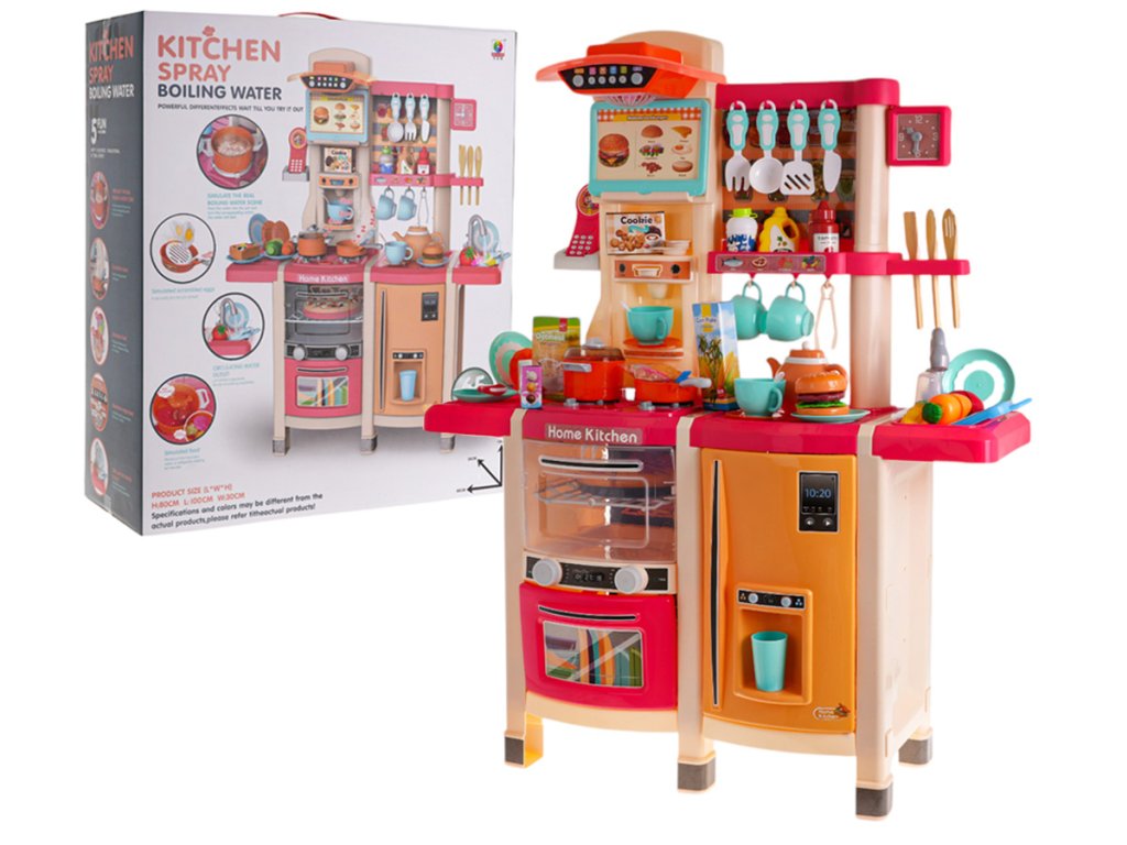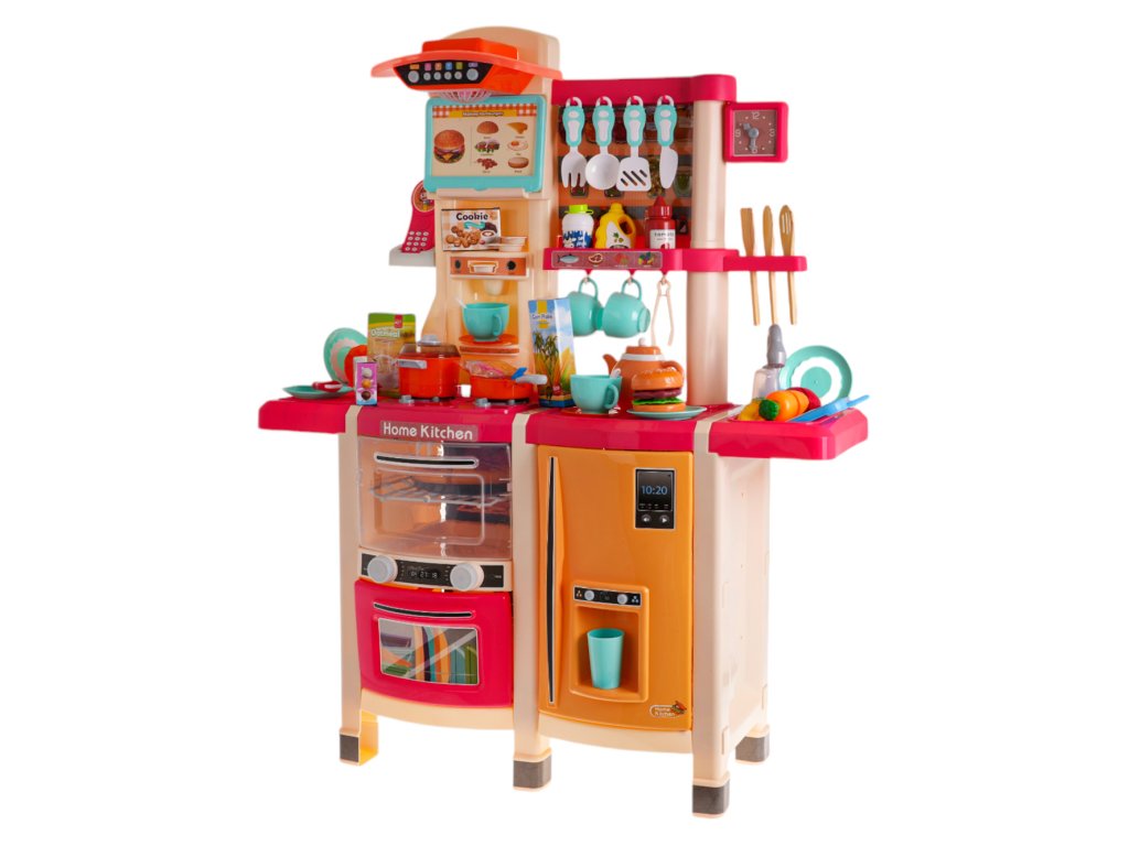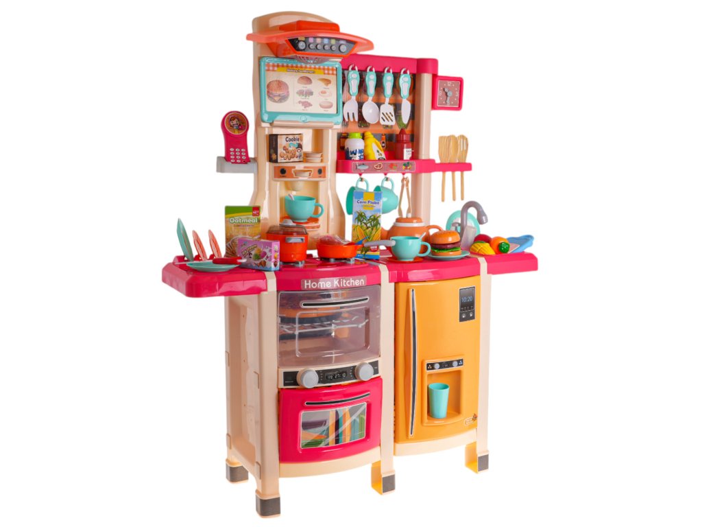 - suitable for children from 3 years of age, - made of the best quality plastic in vivid colors, - richly equipped, the set consists of as many as 65 elements, - movable knobs, - burners with backlight, - frying and cooking sounds, - a tap with running water, - opening fridge with a fake water dispenser, - opening oven with sounds and light, - opening dishwasher, - built-in coffee machine, - panel with fan, lights and sounds, - telephone with sounds (ringtones, animal sounds, song) and illuminated antenna, - frame for recipe cards, - clock with moving hands, -battery-powered pressure cooker that produces bubbles in the water and cooking sounds, - 3 products (fish, crayfish, piece of meat) change color when placed in the pressure cooker. |