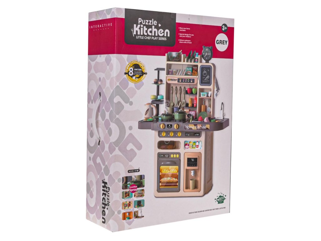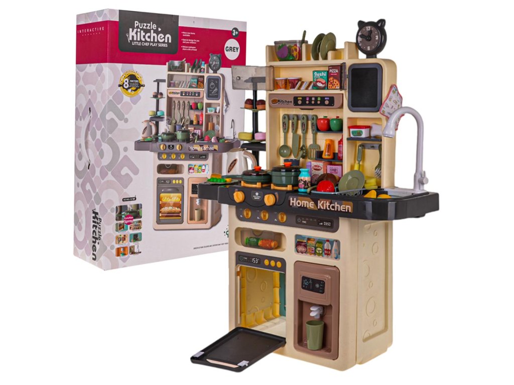 A fantastic, richly equipped, large multifunctional kitchen for children over 3 years of age. The kitchen has a sink with a tap from which water is poured, illuminated burners with cooking and frying sounds, one of the burners has a steam generating function, movable knobs, a hood with a lamp and a music panel, an opening oven, a refrigerator with a water dispenser, a clock, shelves and numerous kitchen accessories. The set is powered by 7 x AA 1.5 V batteries (not included).
