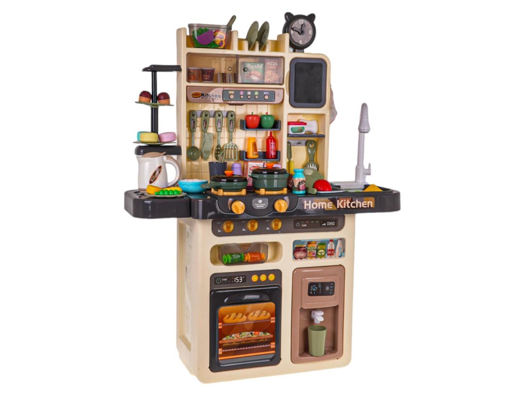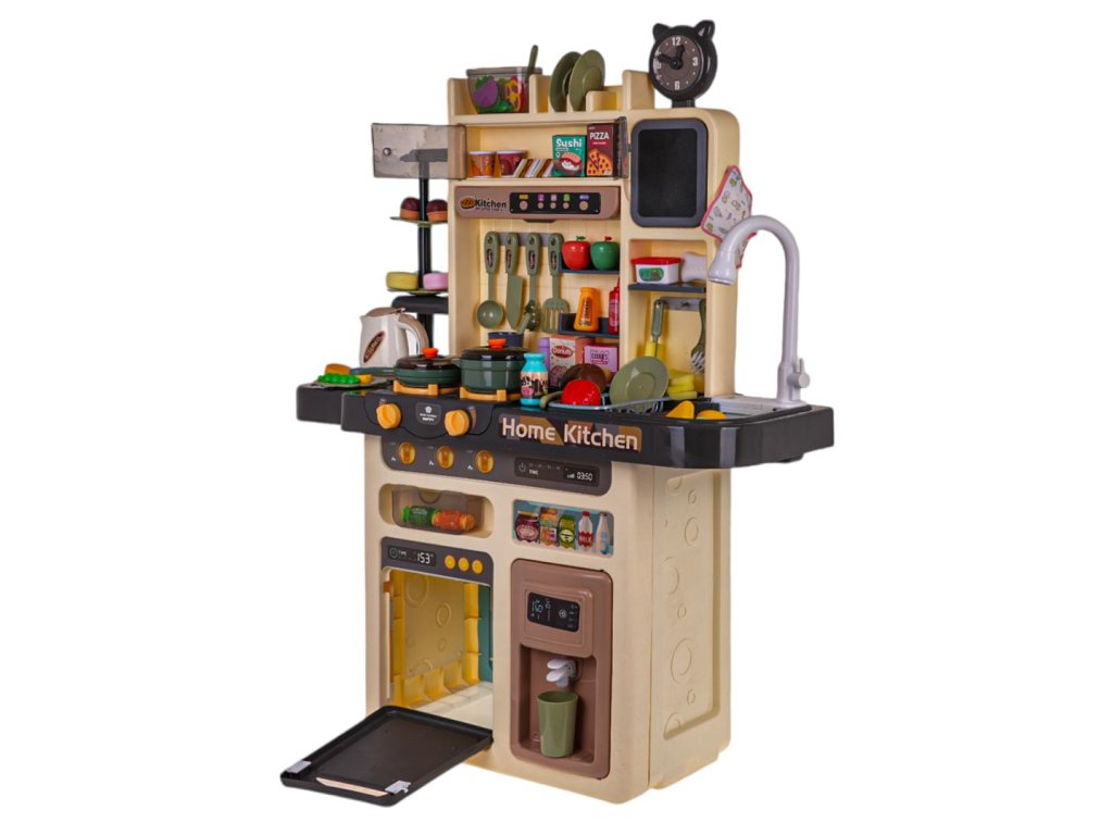- suitable for children over 3 years of age, - made of the highest quality plastic, - light under the sound panel, - sound effects: sounds from the music panel, stories, sounds made by the cooker hood, volume control, frying and cooking sounds, - movable knobs, - steam from the burner, - tap water, - opening fridge with water dispenser, - opening oven, - opening cabinets, - clock with moving hands, - removable chalk board for drawing. |