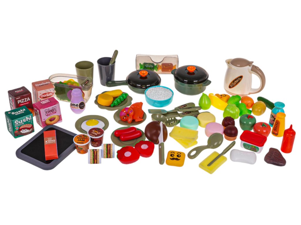 - large kitchen, - chalk board, - chalk, - 4 x sponge, - sponge gripper, - pot with lid, - frying pan with lid, - container for kitchen accessories, - a bowl of rice, - electric kettle, - 2 x cup, - 3 x plate, - plate, - salt shaker, - pepper shaker, - sour sauce, -ketchup, - milk, - 2 x jam, - 2 chocolates, - 3 cookies, - 2 x candy. - strawberry, turnip mushroom, - sausages, fried egg, shrimp, cucumber, banana, 6 x slice of pepper, 2 x slice of carrot, 2 x lettuce leaf, 2 x peas, star fruit , 2 x broccoli, 2 x slice of onion, potato, pear, corn, fish, carrot, steak, 2 x sandwich, - 3 small spoons, - spoon, knife, fork, - ladle, strainer, spatula, knife, - boxes of cookies, pizza or sushi, - cloth, - set of stickers. |