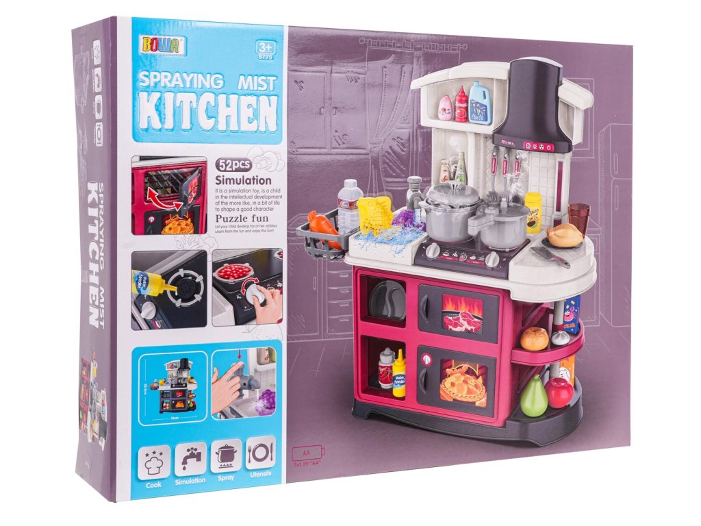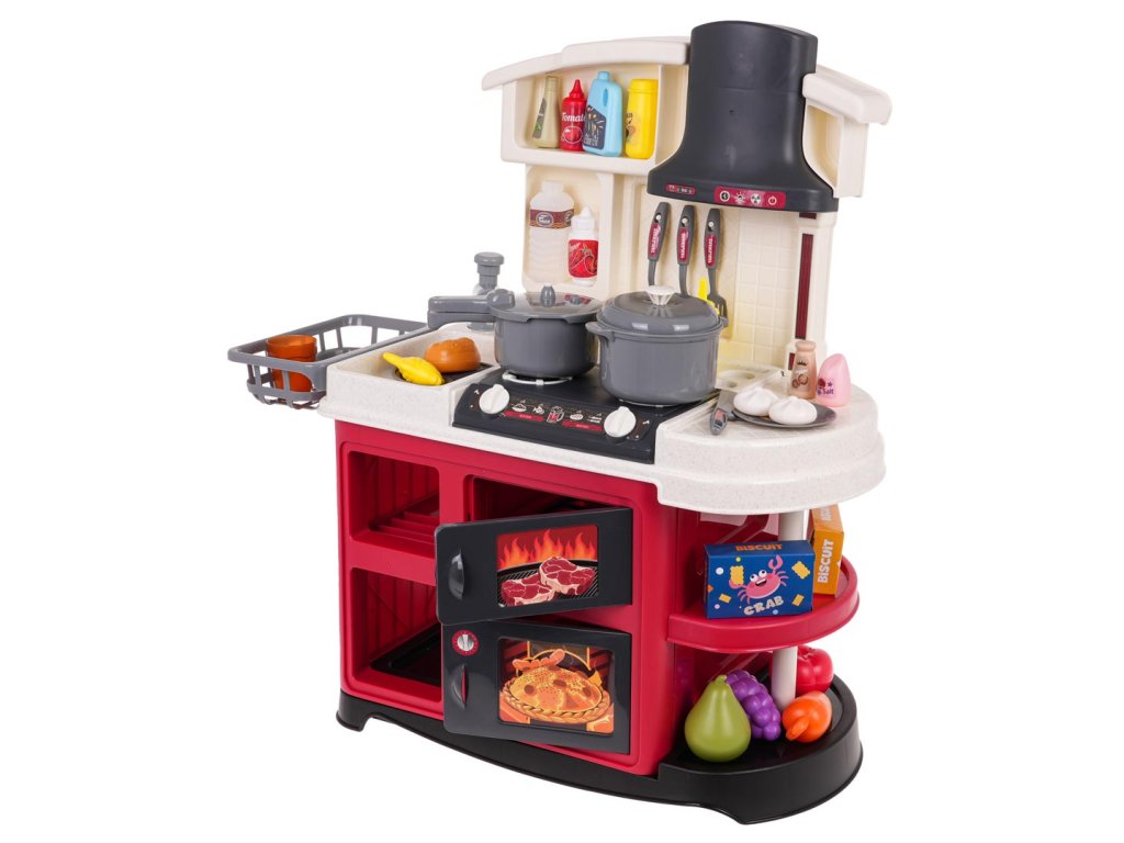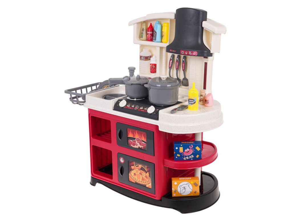 - suitable for children from 3 years of age, - made of the best quality plastic in vivid colors, - richly equipped, the set consists of 52 elements, - stable construction, - movable knobs, - burners with backlight, - frying and cooking sounds, - a tap with running water, - opening oven, - opening grill, - cold steam emerging from one of the burners, - dummy kitchen hood. |