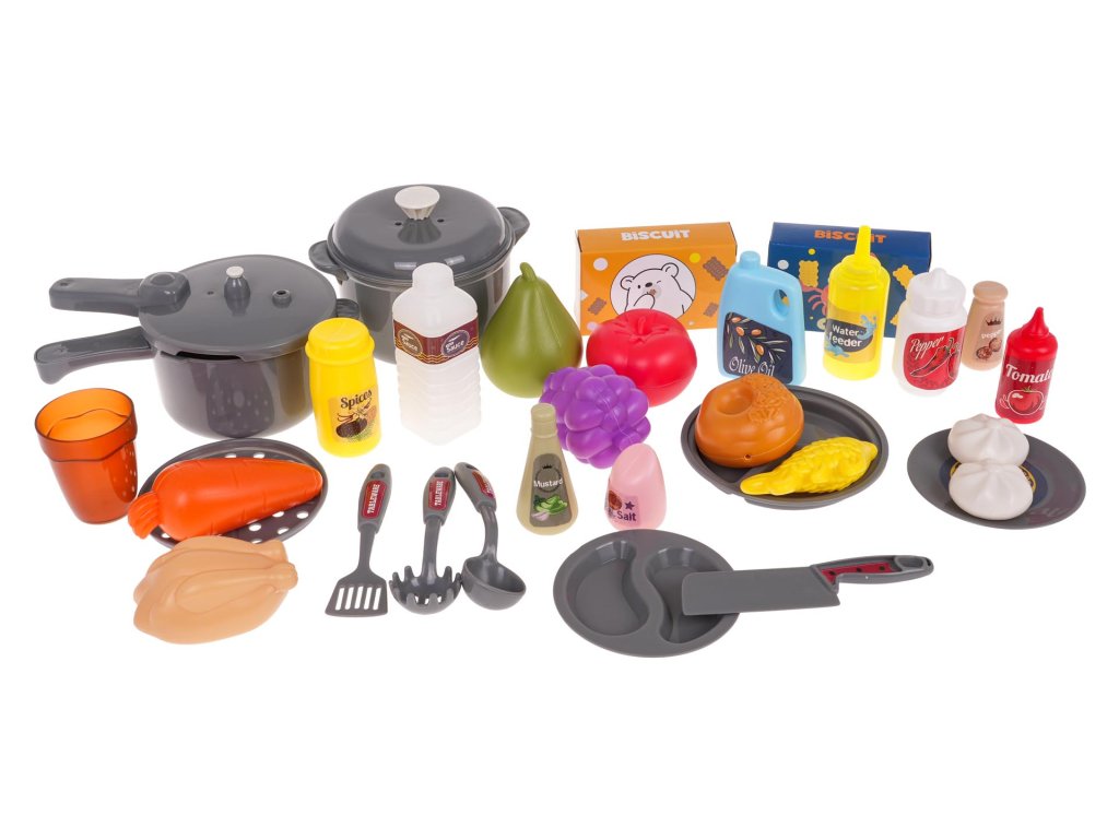 - kitchen, - pressure cooker, - pot with lid, - 3 baking trays, - plate, - 2 x cookie boxes, - a cup, - meat spatula, - pasta spoon, - a ladle, - large knife, - salt shaker, - pepper, -ketchup, - mustard, - oil container, -2 spice container, - container of fish sauce, - water bottle, - food products: tomato, carrot, chicken, fish, pear, grapes, 2 x meringue, cake, - decorative stickers. |