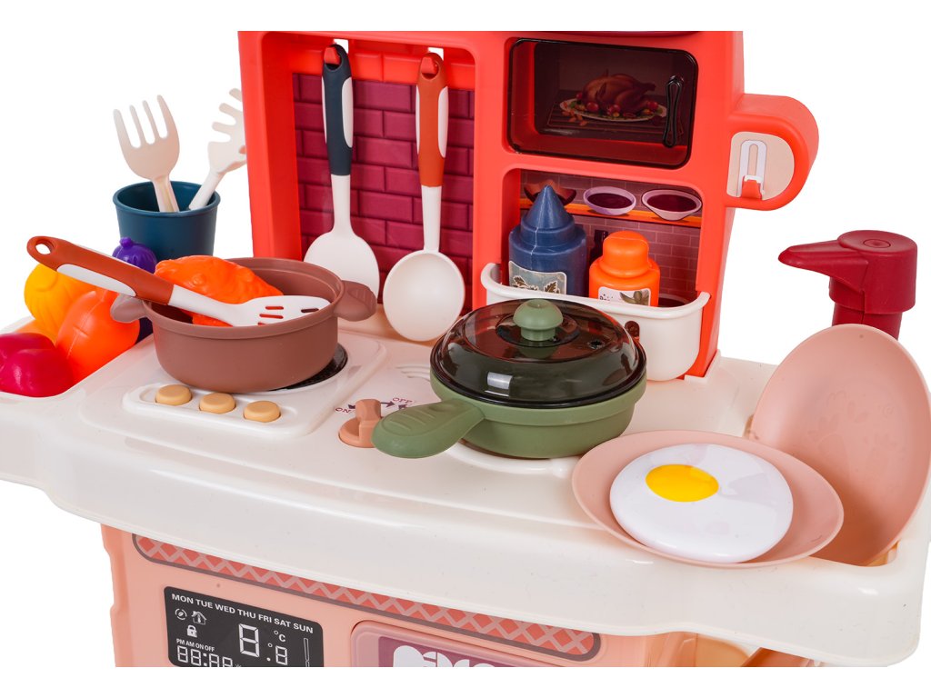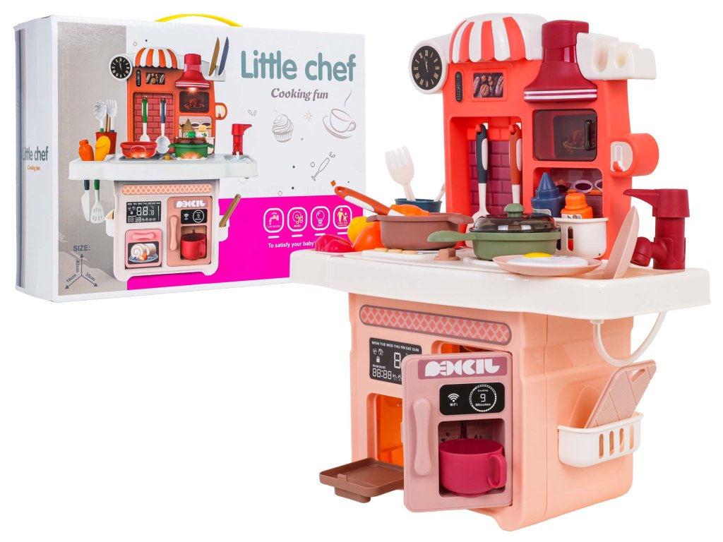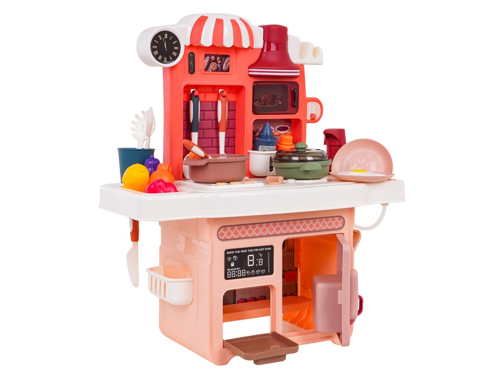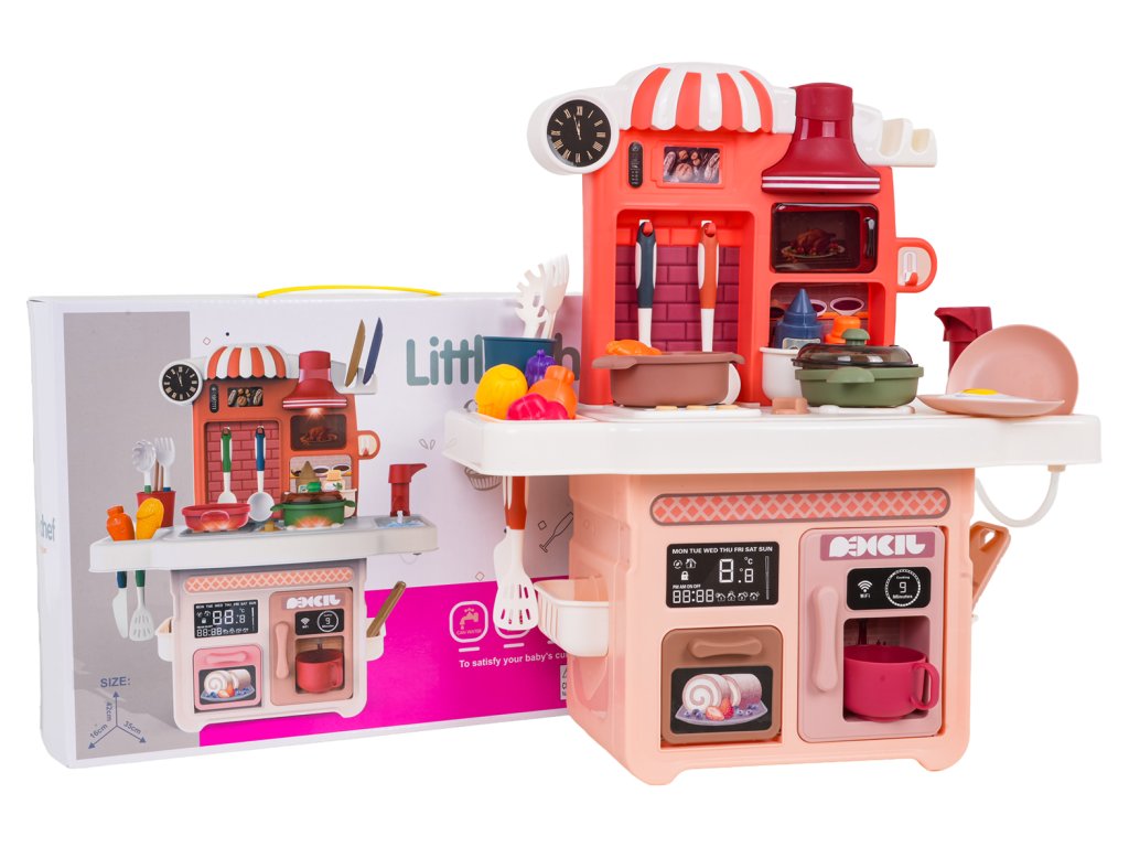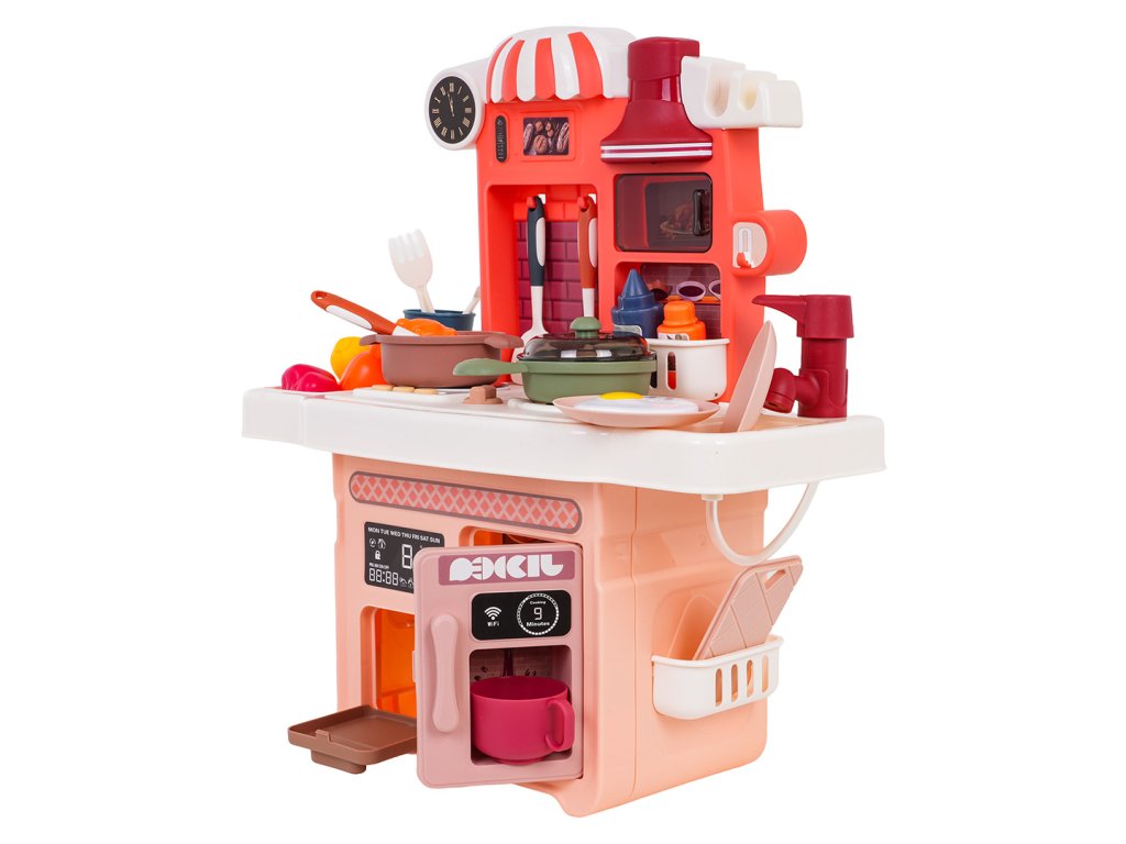 An interactive kitchen with lights, sounds, a water spout, and a multitude of accessories, suitable for children aged three and up. The kitchen is exquisitely crafted from top-quality plastic and features vibrant colors that encourage play. The kitchen countertop features an interactive cooktop with burners. Turning the knob triggers cooking and frying sounds. The cooking and frying sounds are accompanied by backlighting. Pressing one of the three buttons plays various songs, nursery rhymes, and safety tips. Water actually flows from the tap (using a pump), just like in a real sink, allowing children to wash toy dishes. The set also includes a mock coffee machine and oven, as well as a lighted hood. The entire set looks fantastic. The toy is powered by 3 x AA 1.5V batteries for the cooktop (batteries not included), and 3 x AG13 batteries for the hood (batteries included).