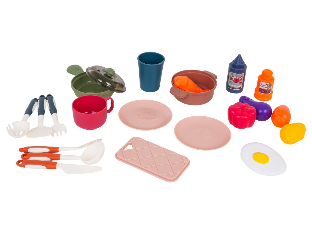 - kitchen, - frying pan, - pot with lid, - a cup, - a mug with a handle, - chopping board, - 2 x plate, - knife, - 2 x spatula, - a ladle, - pasta spoon, - large fork, - ketchup, - pepper, - mock food products: fish, yellow pepper, tomato, carrot, eggplant, corn, fried egg. |