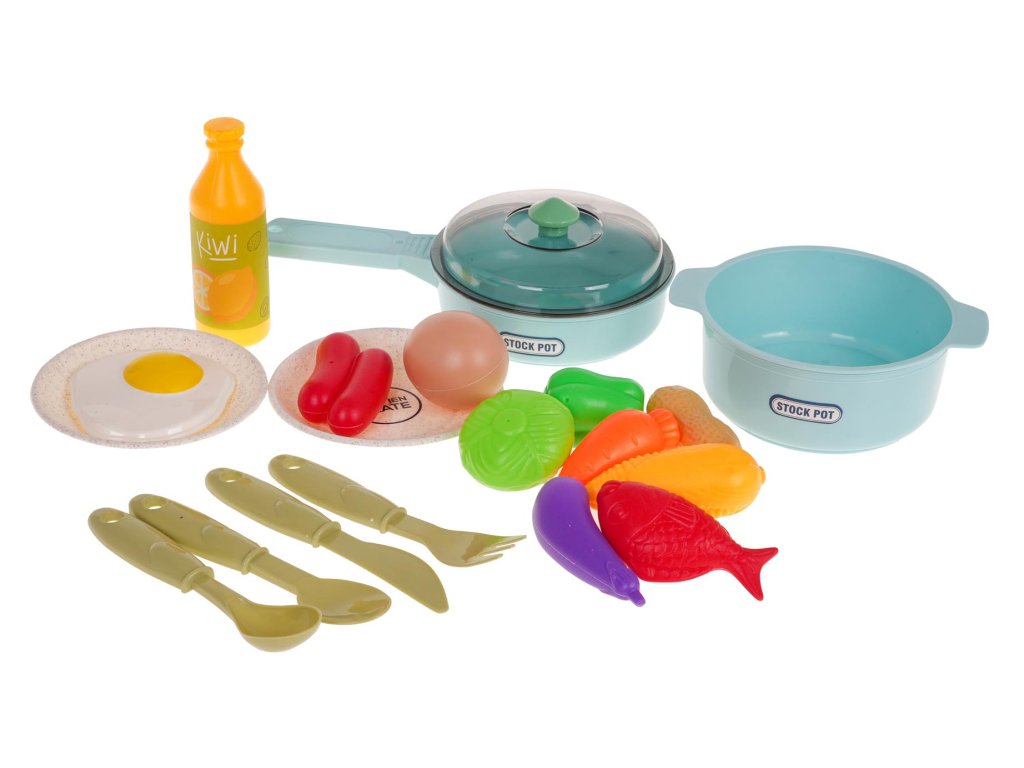 - kitchen, - pot with lid, - frying pan, - 2 x plate, - a ladle, - 3 x cutlery, - food product mockups: fried egg, hard-boiled egg, fish, lettuce, pepper, sausages, eggplant, corn, carrot, peanut, milk, juice, - decorative stickers, - assembly instructions. |
