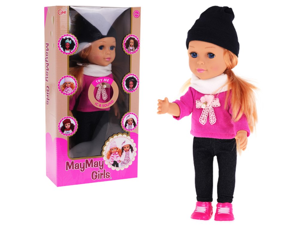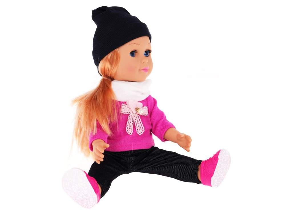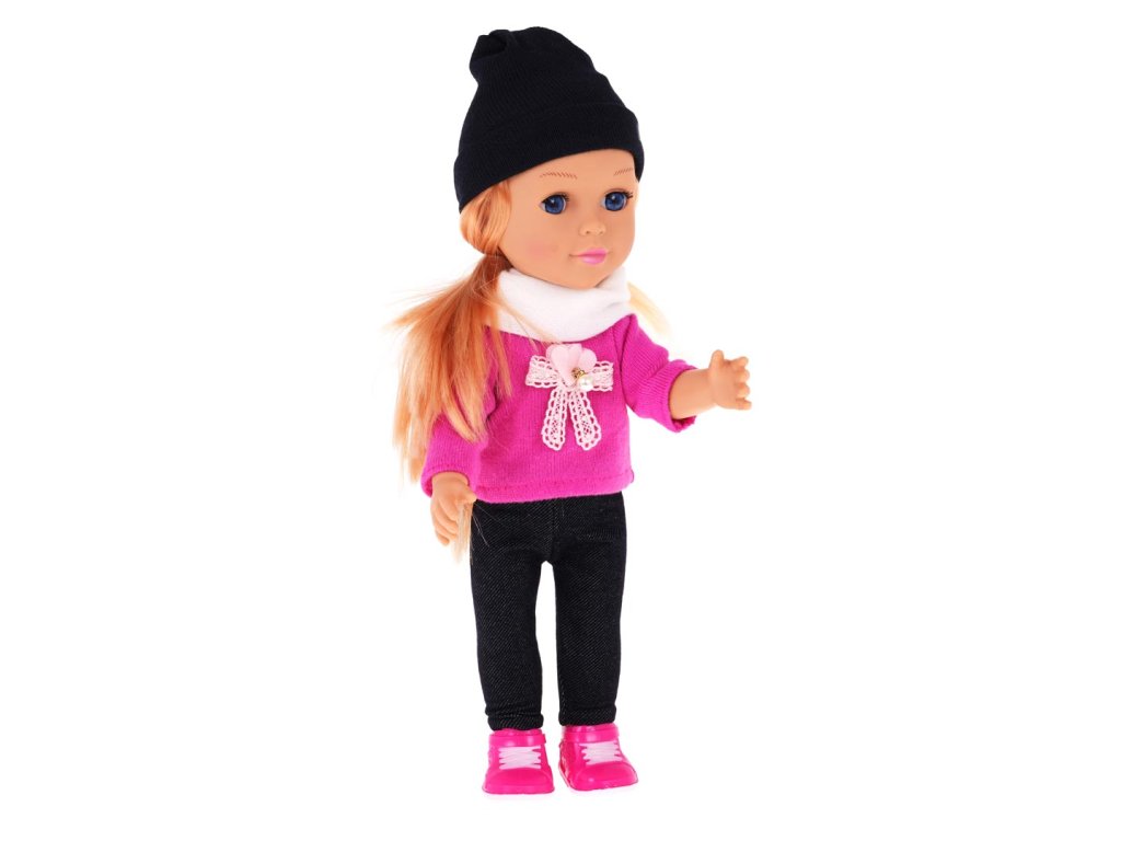 A beautiful doll, for a child from 3 years of age. The doll is perfectly finished, with attention to every detail and completely safe for a child. She is dressed in a sweater, pants, shoes, hat and scarf. We can take off the clothes and change the doll into other ones. Movable legs, arms and head make changing easier. The doll is powered by 3 AG13 batteries (included), when you press her tummy you can hear a cheerful song. The toy stimulates the child's motor development.