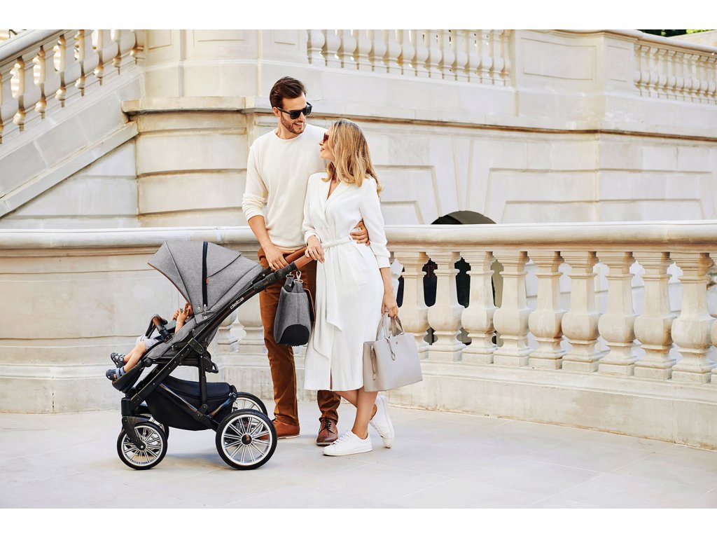 - velká praktická taška upevněná na rukojeti kočárku