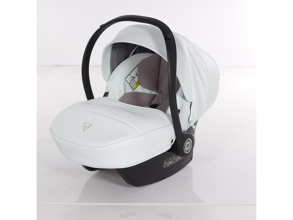 Kompletní travel system. Autosedačka se přímo připojí na rám kočárku — přenesete spící dítě z auta na kočárek bez probuzení, bez sundávání pásů. Bezpečnostní standard I-Size chrání dítě od prvních dnů.