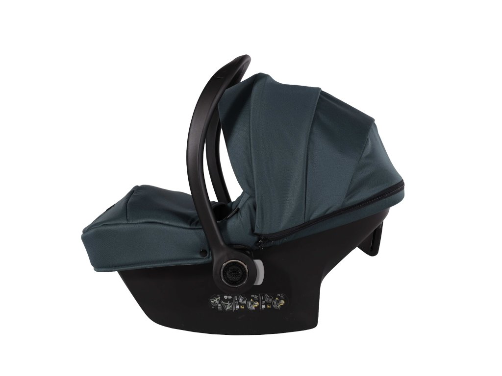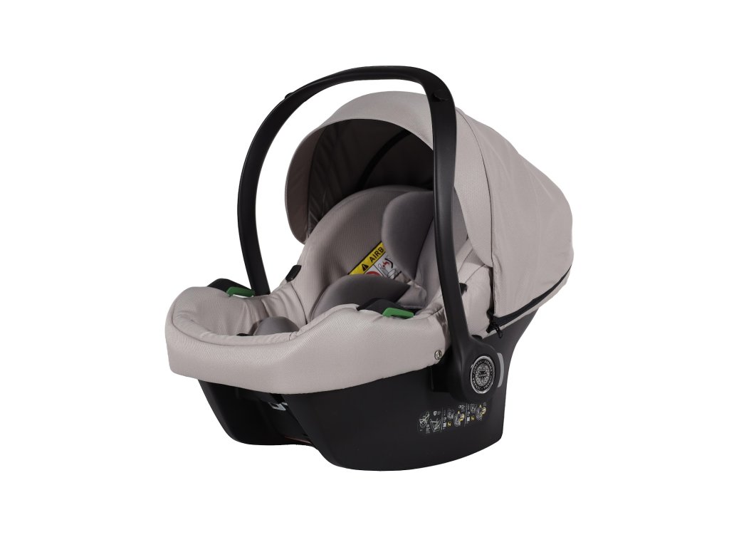 Kompletní travel system. Autosedačka se přímo připojí na rám kočárku — přenesete spící dítě z auta na kočárek bez probuzení, bez sundávání pásů. Bezpečnostní standard I-Size chrání dítě od prvních dnů.