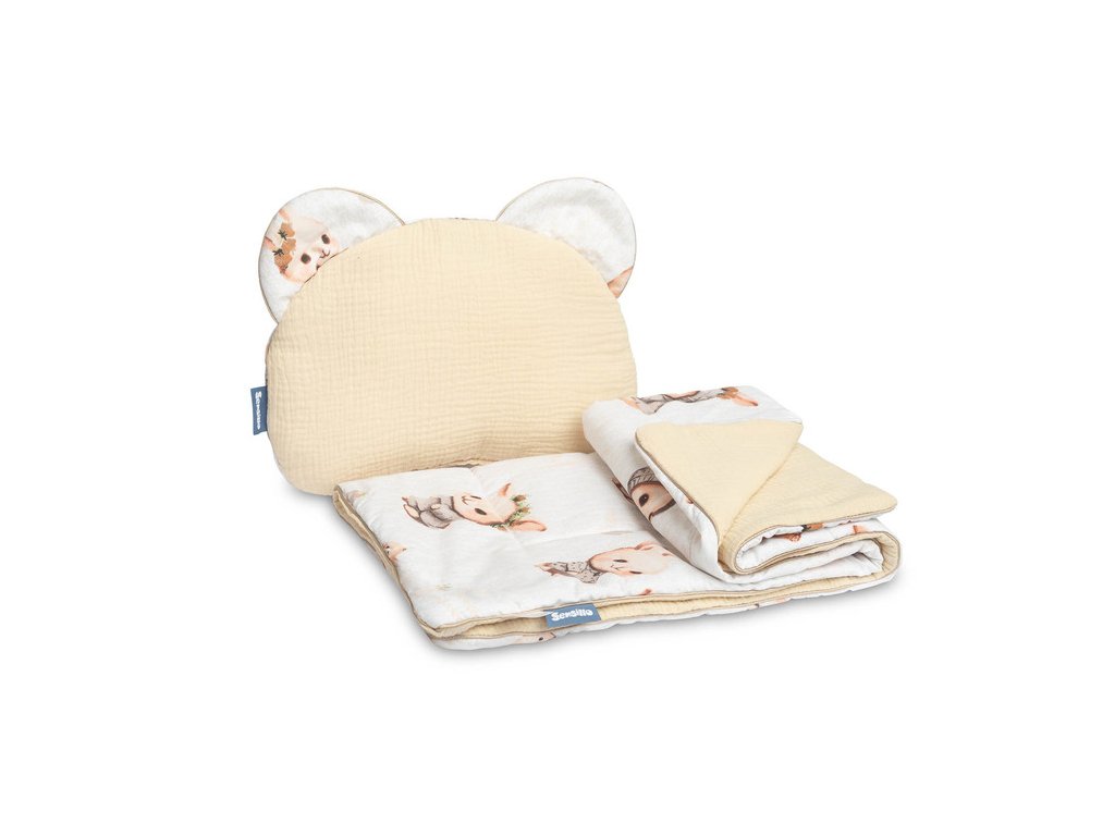 W skład kompletu wchodzi poduszka i kocyk wykonane z przyjemnego w dotyku muślinu i bawełny. Komplet idealnie sprawdza się w wózku, łóżeczku czy jako miękka mata dla Maluszka. Sama poduszka może służyć jako przytulanka. Zestaw został wykonany z dwóch materiałów – strona wewnętrzna to 100% bawełna, a warstwa zewnętrzna to miękki muślin.