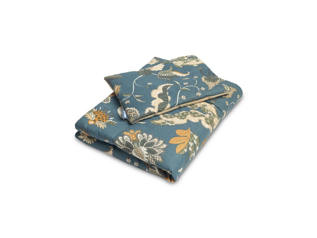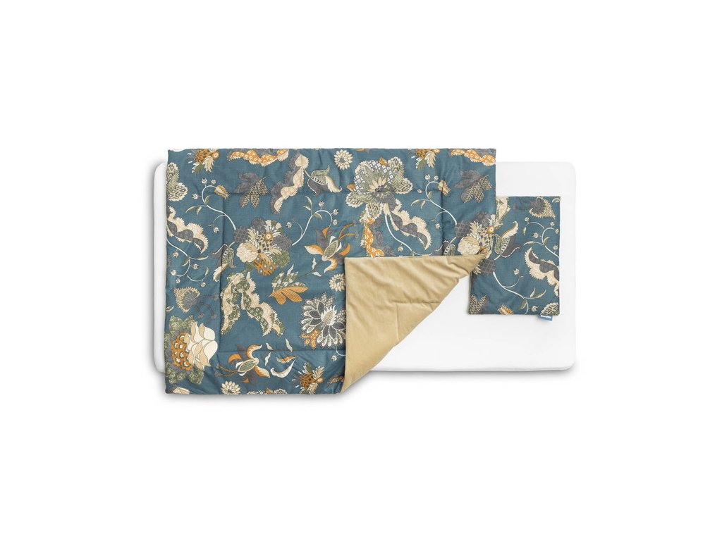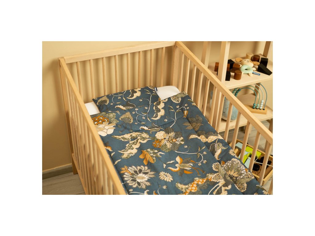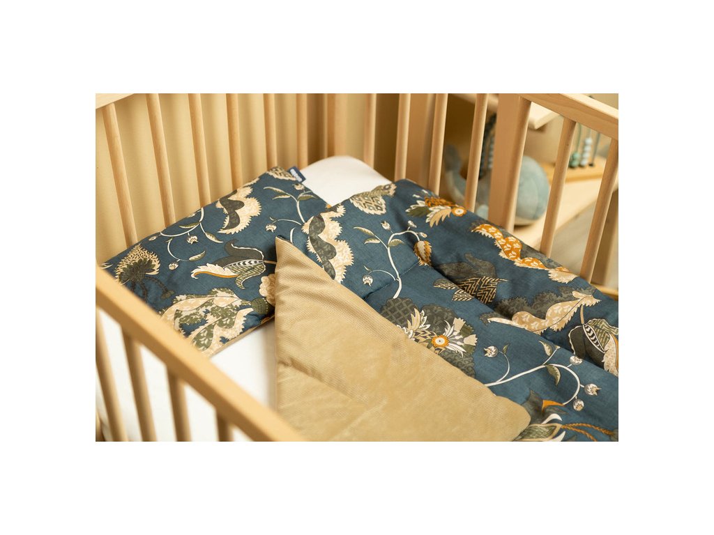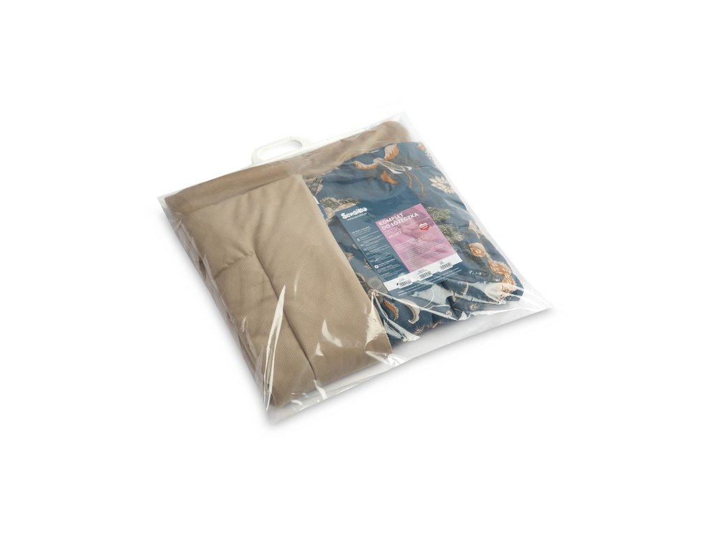 Komplet do łóżeczka jest wykonany z jednej strony z wysokiej jakości kolorowej bawełny, a z drugiej przyjemnego w dotyku velvetu. Składa się z płaskiej poduszki oraz kołderki z antyalergicznym wypełnieniem. Milutka tkanina przyjemnie otuli każdego maluszka.