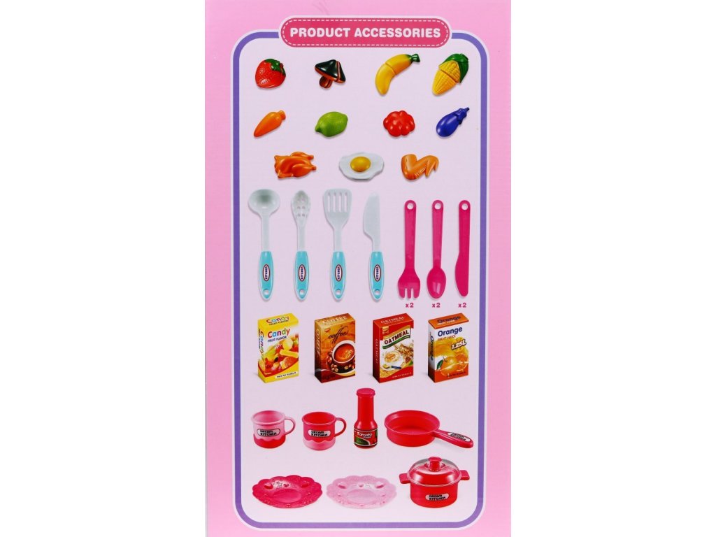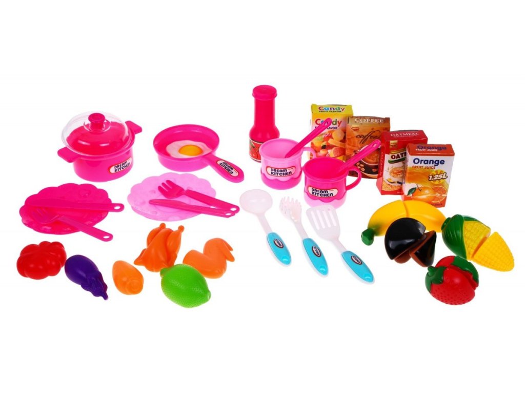 - kitchen, - chef's hat and apron, - 2 x plate with a diameter of about 10.5 cm, - pot with lid approx. 7 cm x 8.5 cm, - frying pan approx. 15 cm x 3 cm, - 2 x cup about 5 cm x 7 cm, - a bottle with ketchup about 9.5 cm x 4 cm, - 4 x cardboard box (candy, orange juice, porridge, coffee) approx. 7.5 cm x 5 cm x 2 cm, - 2 x fork approx. 11 cm x 3 cm, - 2 x spoon approx. 11 cm x 2.5 cm, - 2 x knife approx. 11 cm x 2 cm, - ladle approx. 13.5 cm x 4 cm, - shoulder approx. 13.5 cm x 3.5 cm, - slotted spoon approx. 13.5 cm x 2.5 cm, - knife approx. 13.5 cm, - vegetables and fruit with turnips (corn, banana, strawberry, mushroom), - other fruit and vegetables (pumpkin, eggplant, carrot, lime), - dishes (chicken wing, chicken, fried egg), - a set of stickers for decoration. | |