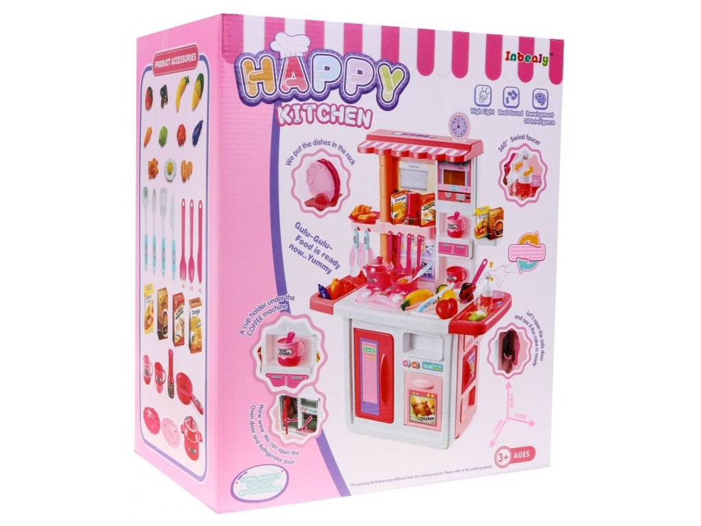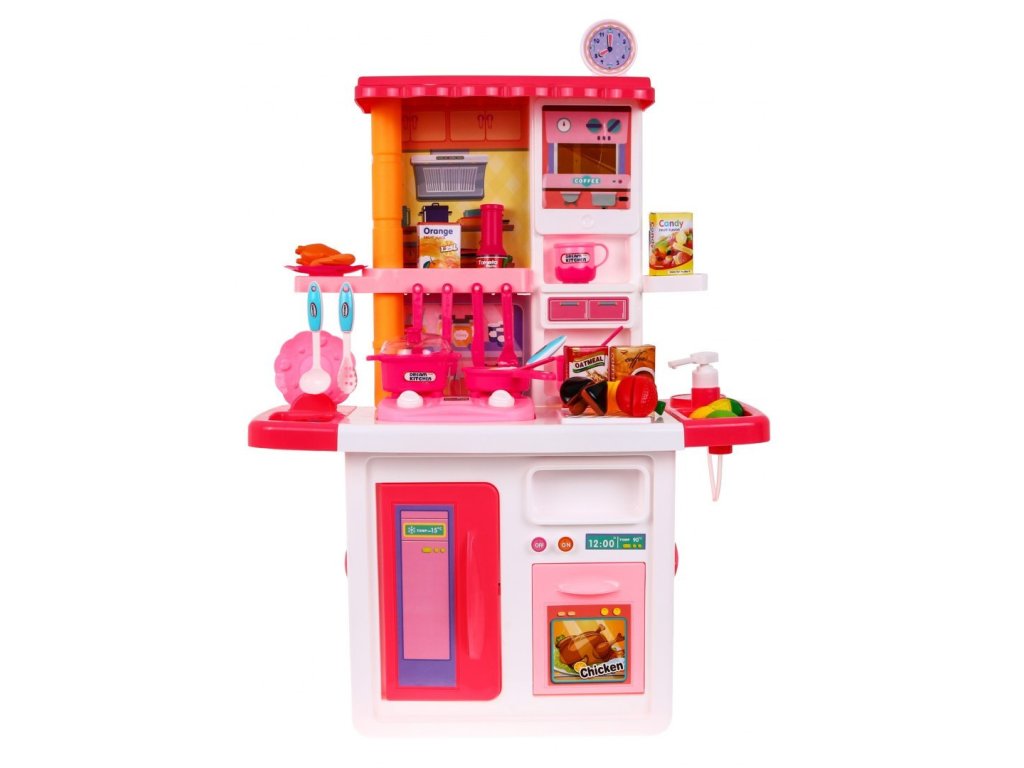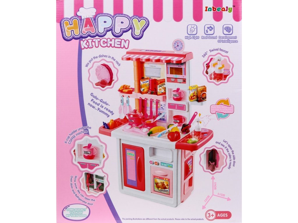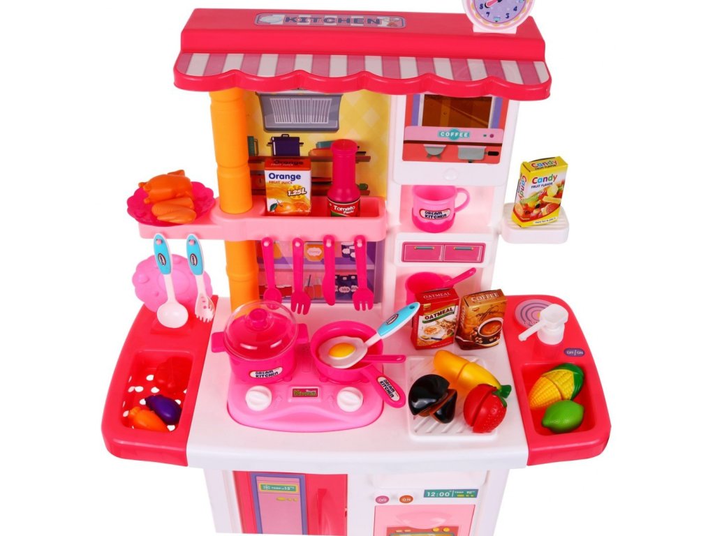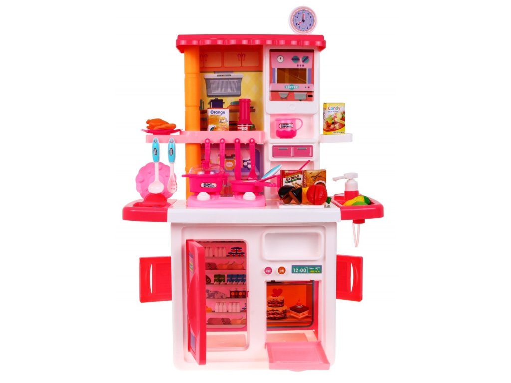 | Sensational, well-equipped kitchen for small chefs and cooks. The kitchen has a sink with a tap for real water, sensory induction burners, movable knobs, hood, openable oven, fridge and cabinets, shelves and numerous kitchen accessories. The burners are illuminated and make cooking and frying sounds. The set includes a chef's hat and apron, so that your child feels like a real chef. The apron has 2 pockets, e.g. for kitchen accessories. Excellent workmanship, vibrant colors, colorful packaging. The toy is powered by 2 x AA batteries (not included). Toy for children over 3 years old, has CE certificate. |