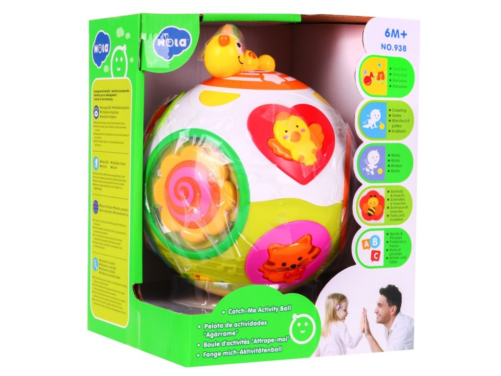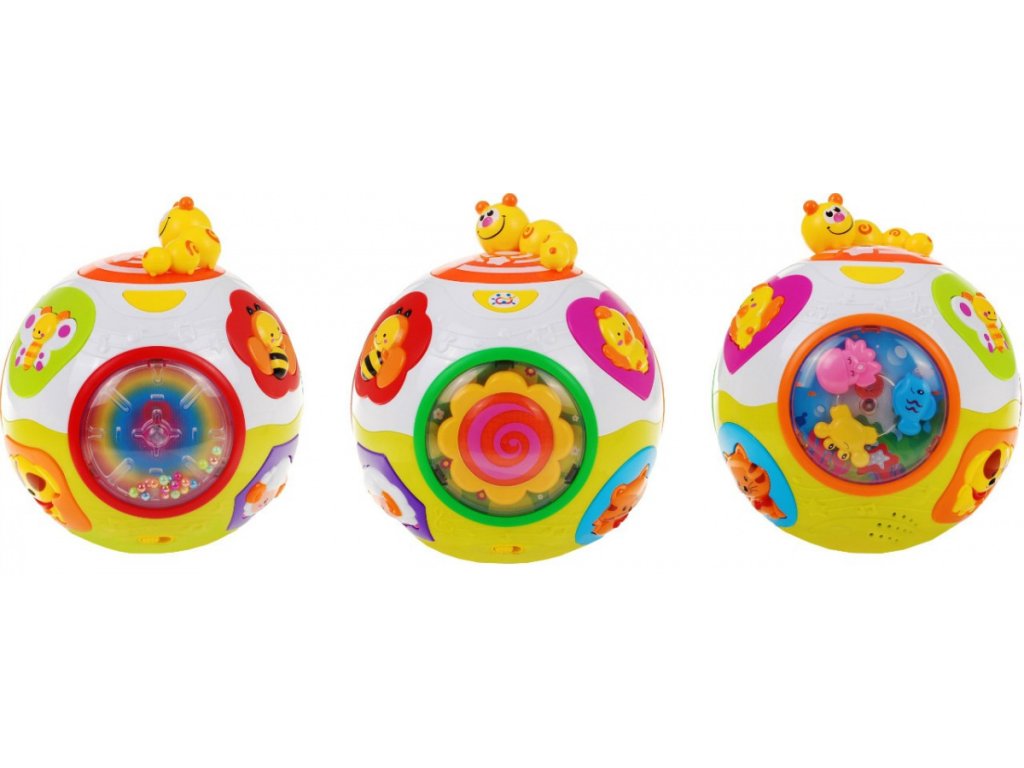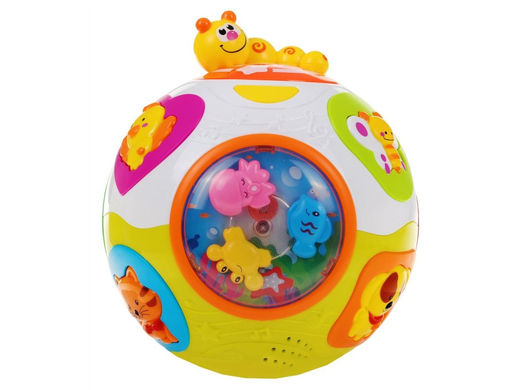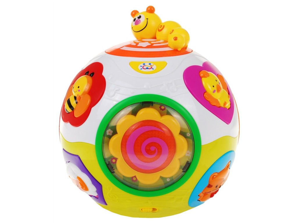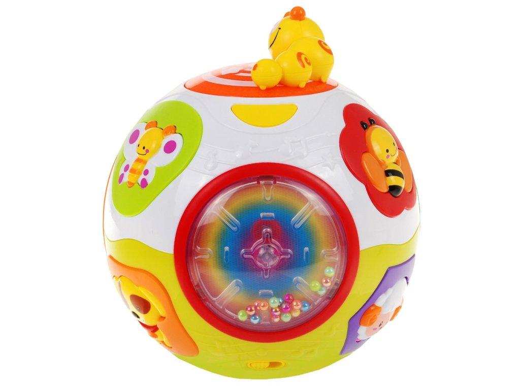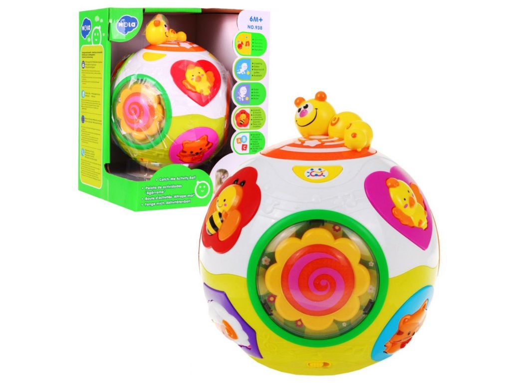 - the ball is equipped with a mechanism that automatically sets it in motion, just press the switch on its bottom, - this button is also responsible for the volume, - in addition, the ball is equipped with two modes of operation, the first one where cheerful noises, melodies and glowing colored lights are available, and the second mode, where the above-mentioned functions are accompanied by the spontaneous movement of the ball, - the spinning ball is accompanied by flashing colored lights and funny sounds, - the ball is equipped with various buttons in the shape of colorful animals: dog, cat, sheep, bird, butterfly and bee, - pressing the animal characters one by one we will hear the dog barking, the meow cat, and the sheep - An additional attraction is the individual panels rotating to the music - a flower with a spiral, colorful sea animals or rainbow rattling balls. | |