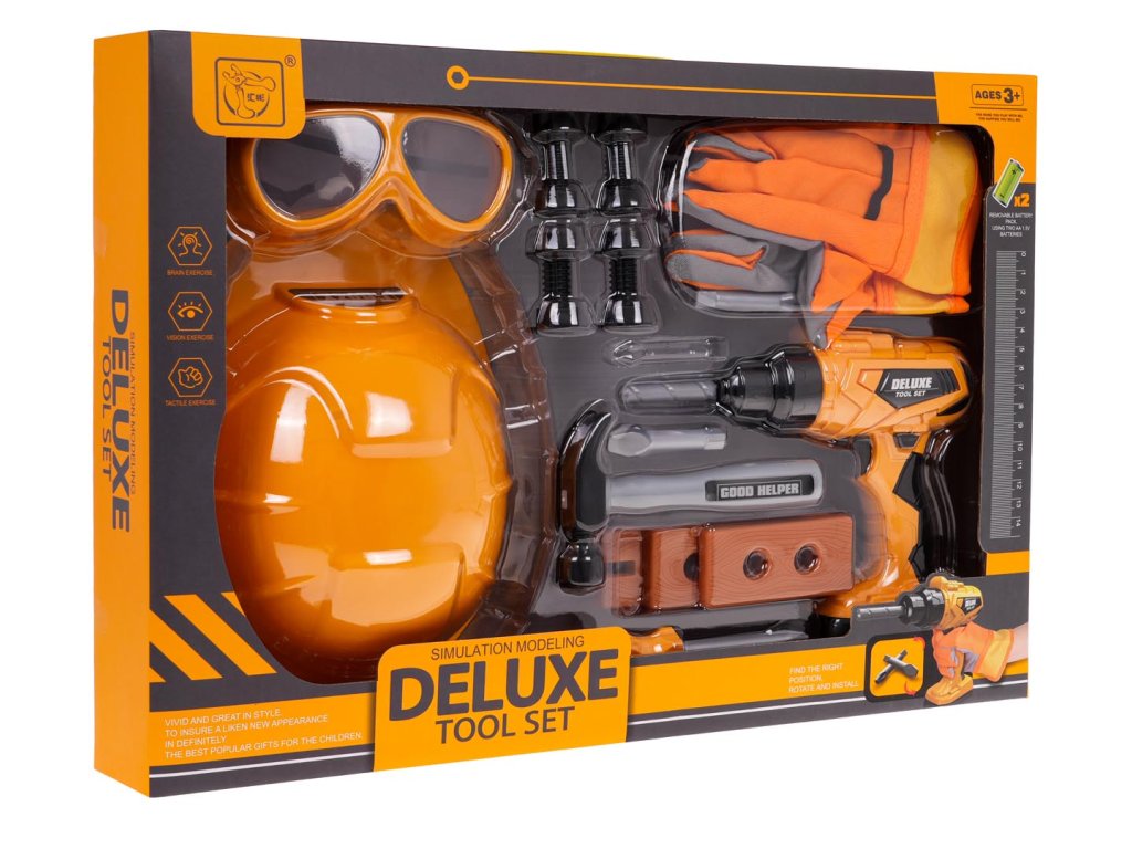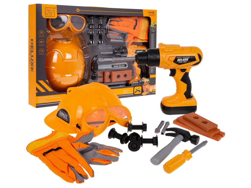 A small handyman's set with a helmet and an interactive screwdriver-drill for children over 3 years of age. The set is made of the highest quality plastic and contains 20 elements. The set includes: a helmet, gloves, a screwdriver, a hammer, safety glasses, wood for screwing, covers, screws and a drill-drill with replaceable bits. The drill is powered by 2 x AA 1.5 V batteries (not included), has sound effects, screws and unscrews the screws included in the set. It has replaceable bits and a removable battery like in a real one for adults.