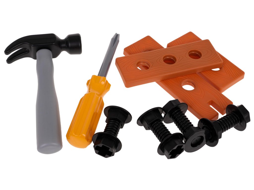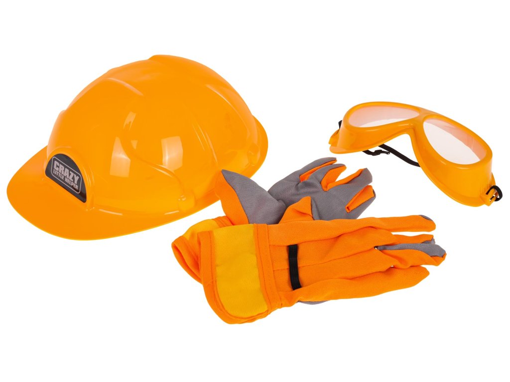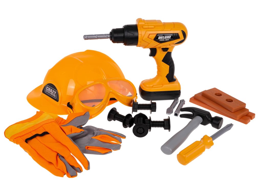 - helmet approx. 18 cm x 23.5 cm x 8 cm, - gloves approx. 13 cm x 19 cm, - screwdriver approx. 15.8 cm x 2.5 cm, - hammer approx. 14.8 cm x 8.5 cm x 2.5 cm, - safety glasses approx. 16 cm x 6.5 cm x 4.5 cm, - wood for screwing approx. 13.5 cm, 11.2 cm and 8.8 cm, - overlay with a diameter of approx. 3 cm, - screw approx. 5 cm long, - drill-drill approx. 16 cm x 18 cm x 5 cm, - interchangeable bits: flat and cross, approx. 6.5 cm long, - packaging approx. 48 cm x 7.3 cm x 33 cm. |