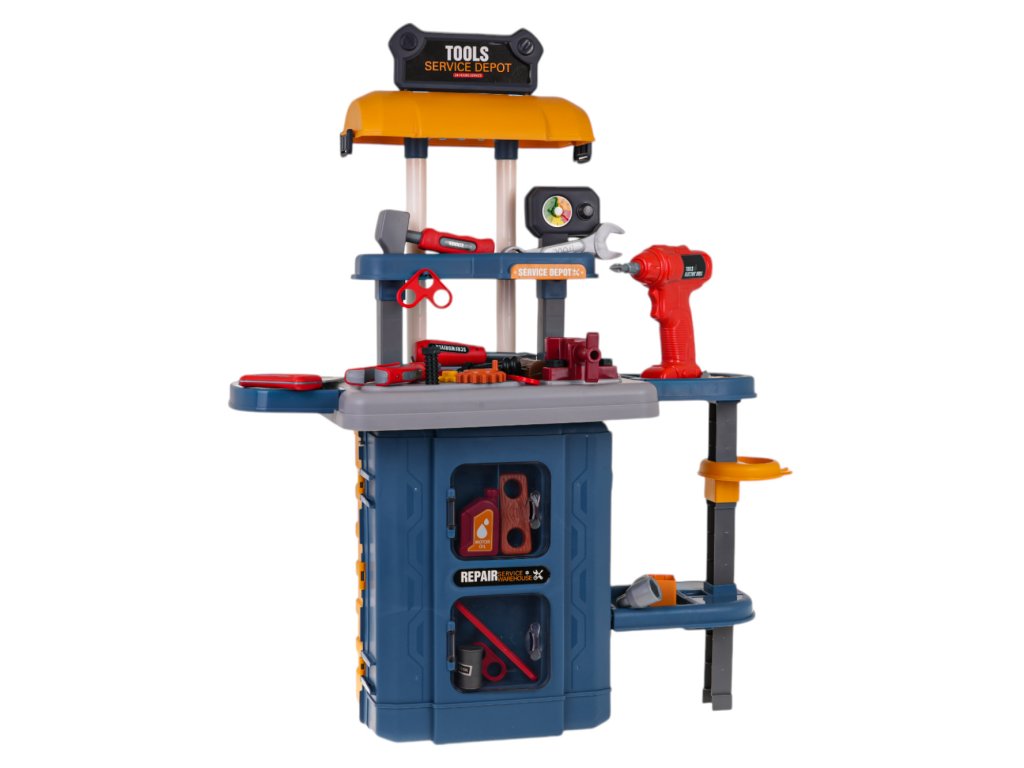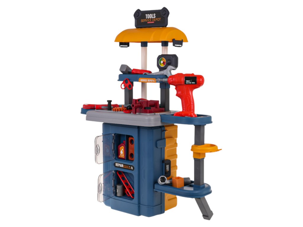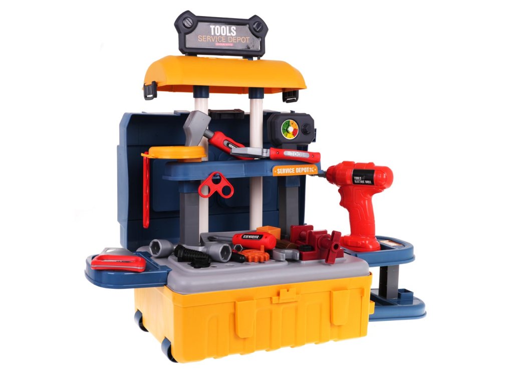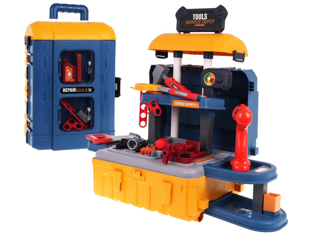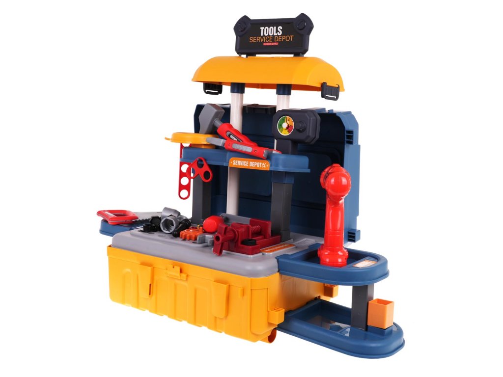 - intended for children over 3 years of age, - made of high quality plastic, - possibility of creating 3 systems: large workshop, small portable workshop, suitcase with handle, - a screwdriver with replaceable bits, powered by batteries, screws and unscrews and produces characteristic sounds, - left and right movable vice, - rich equipment of up to 46 elements. |