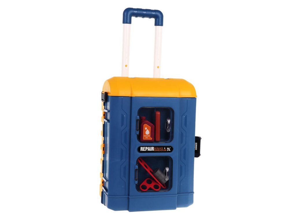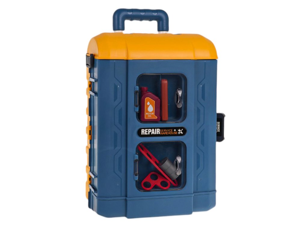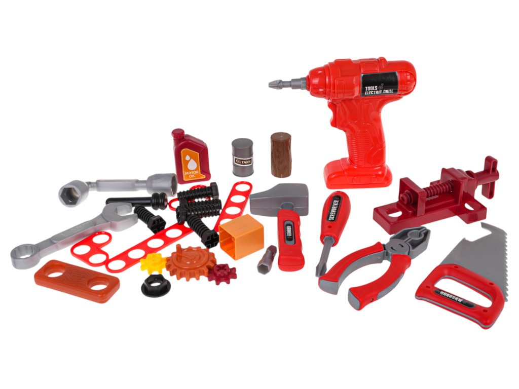 A richly equipped set for a small handyman for children from 3 years of age. The set is made of high-quality plastic and consists of 46 elements. The construction parts of the set can be arranged in 3 different arrangements. The first arrangement will create a large workshop with a table for tools. The second will create a small, portable workshop, and the third arrangement will create a large suitcase with a carrying handle, in which we can fit all the tools. In addition to the construction parts, the set also includes: a battery-powered screwdriver with a movable drill, a vice, a hammer, a saw, keys, a screwdriver, screws and a canister. The screwdriver is powered by 2 x AA 1.5 V batteries (not included).