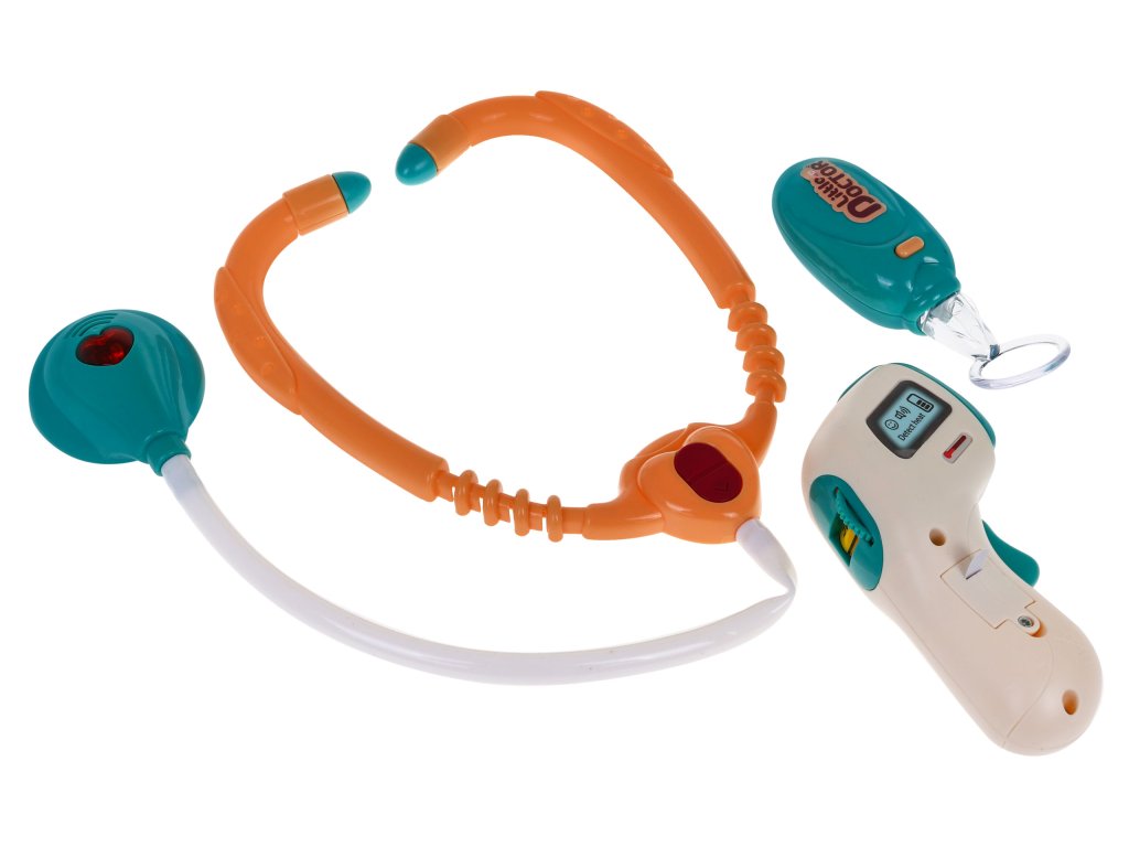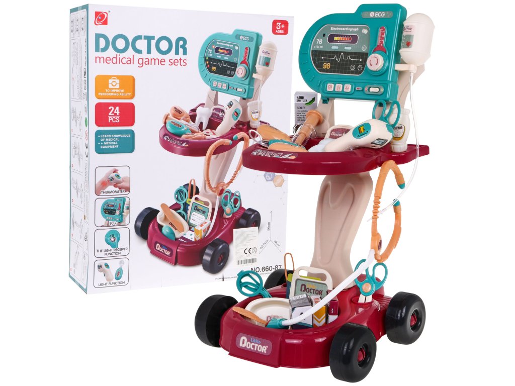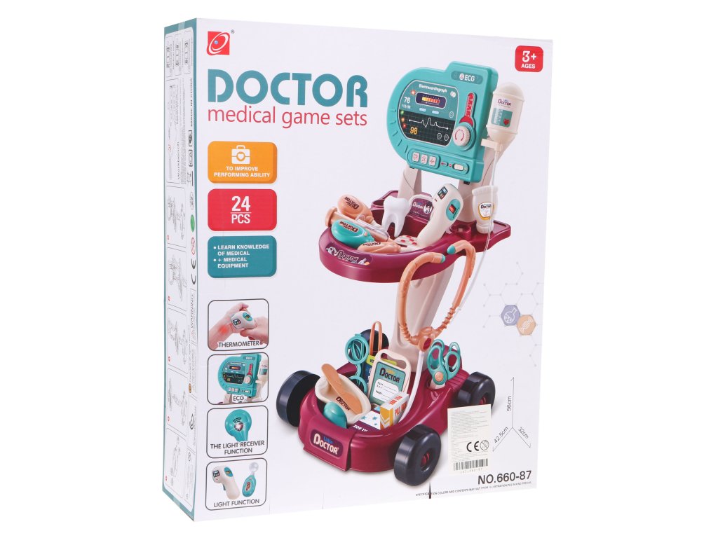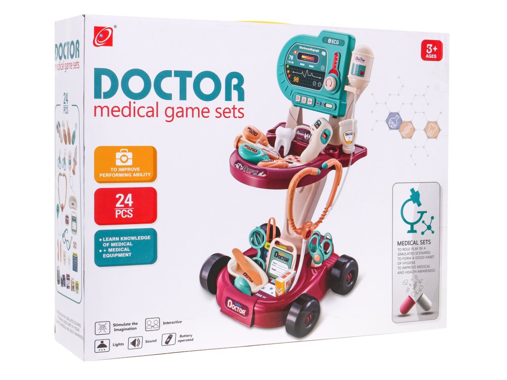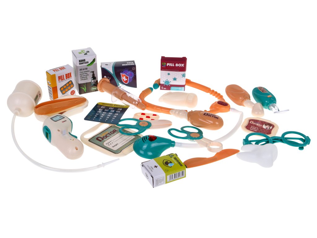| - trolley for accessories with shelves, - ECG panel with a diode signaling the heartbeat, sound of measurement and alarm, - a stethoscope with a heartbeat and a red flashing diode, - diagnostic mirror with backlight, - drip, - glasses, - syringe, - medical kidney, - medical drill, - clove, - thermometer with light and sound, - a tube with a liquid for hand sterilization, - cardboard box with hand disinfectant, - scissors, - bone holder, - neurological hammer, - ID, - patient card, - tweezers, - knife, - medication blister, - ophthalmic board, - eye drops, - a box with medicines, - antiviral drugs, - a box for tablets, - colorful decorative stickers. |