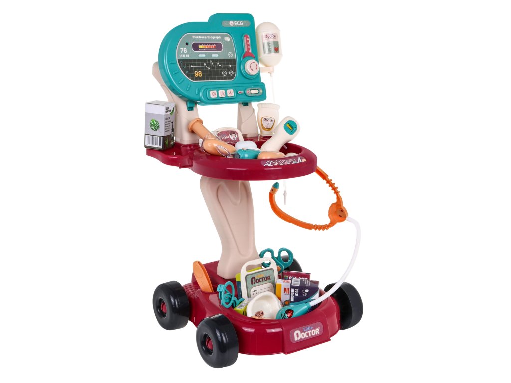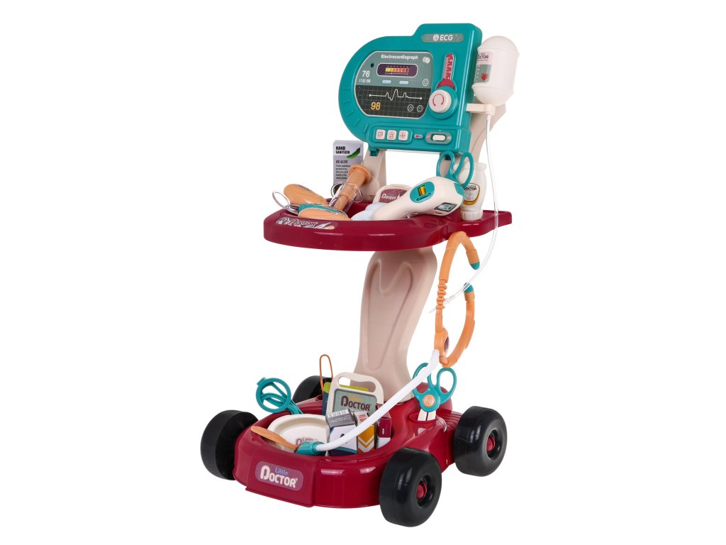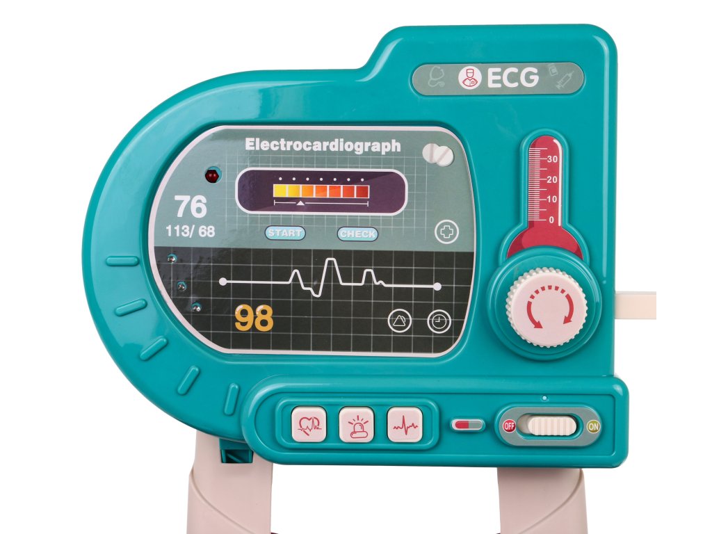 | A safe, colorful interactive set with sound and light effects for children from 3 years of age. The toy is constructed as a comfortable trolley on wheels, which can be quickly moved to any place. The set includes 24 accessories needed to play a little doctor. The EKG panel has the function of light (flashing red diode) and sound (sound of measurement, alarm, heartbeat), it is powered by 2 x AA 1.5V batteries (not included). The stethoscope and thermometer also have a light and sound effect. The stethoscope makes a heartbeat sound and signals it with a red LED. The thermometer makes a measuring noise while the red LED lights up. The diagnostic mirror has a backlight. |
