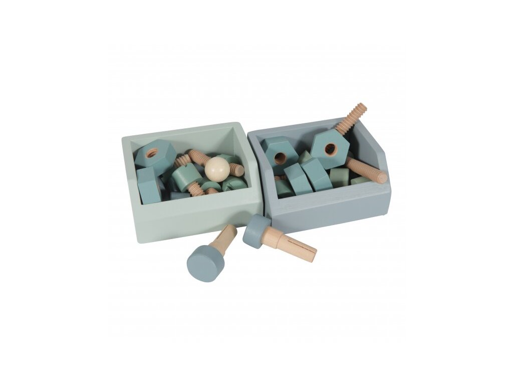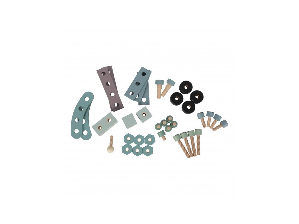 Tento hrací dřevěný pult je dodáván s dřevěným nářadím a příslušenstvím. Kompletní sada se skládá ze 48 dílů, včetně paličky, klíče, šroubováku, matic a šroubů. S praktickým a nastavitelným pásem na nástroje mějte po ruce všechny své nástroje. K dispozici v barvě modrá / máta.